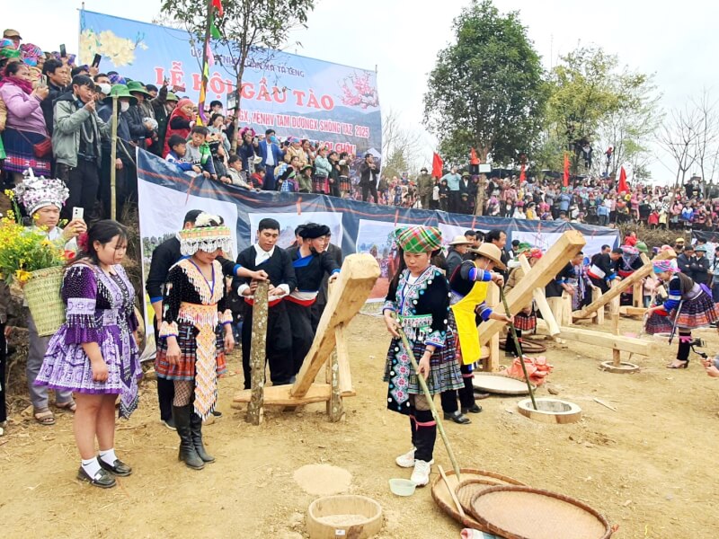 Gau Tao Festival is held jubilantly in early spring on terraced fields in Binh Lu commune. It is the largest and most important festival to give thanks to heaven and earth and to wish for good harvests and prosperity for the people. The highlight of the festival is the towering tree erected in the middle of an open field, where unique folk activities such as Khen dancing, love songs and games of stick pushing and crossbow shooting take place, attracting thousands of people in bright brocade costumes to participate. Tourists who visit on this occasion will be immersed in the gentle sound of the flute, enjoy corn wine and immerse themselves in the dancing circles, bringing a feeling of excitement and warm human love in the heart of the vast mountains and forests of Lai Chau.
