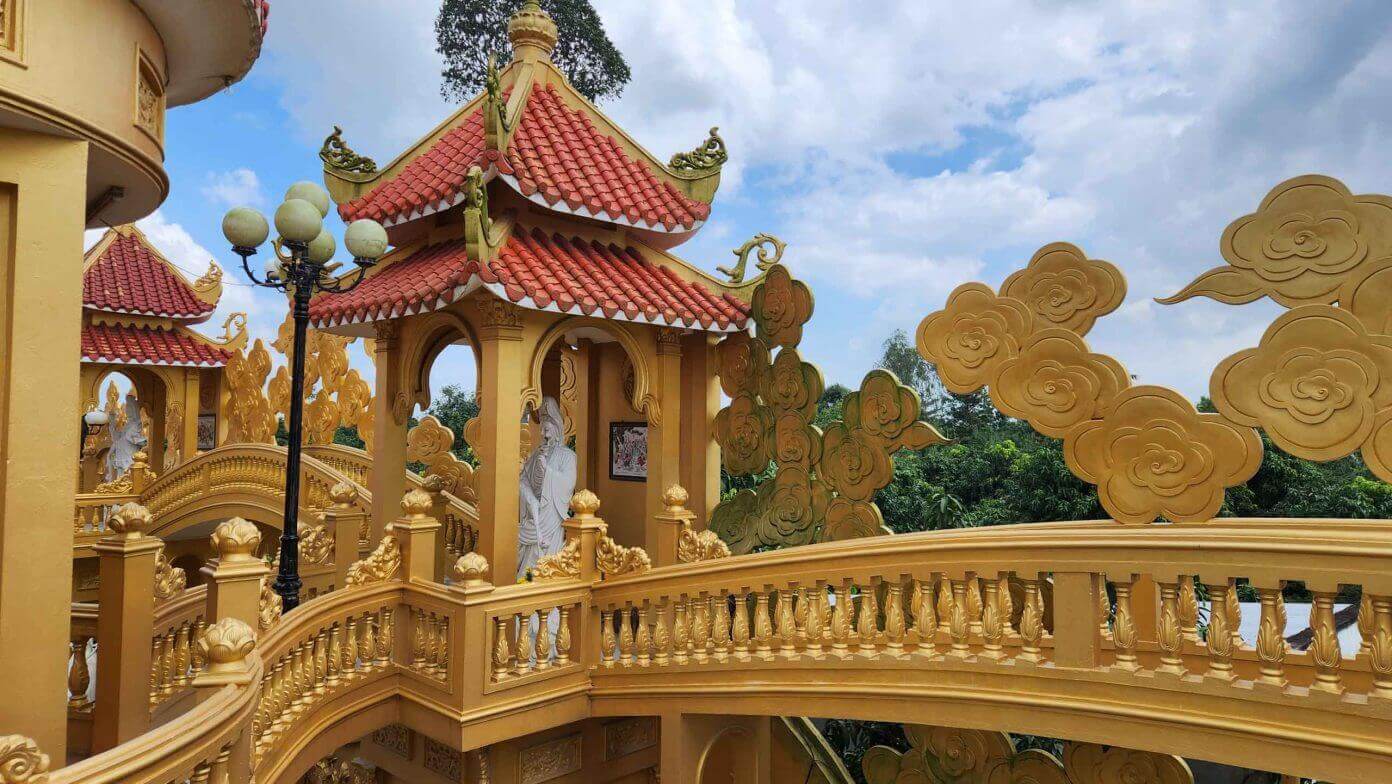 Chùa có hai hành lang nối lên cao,tạo thành “cầu vượt” uốn lượn xung quanh rất độc đáo. Ảnh: T.T