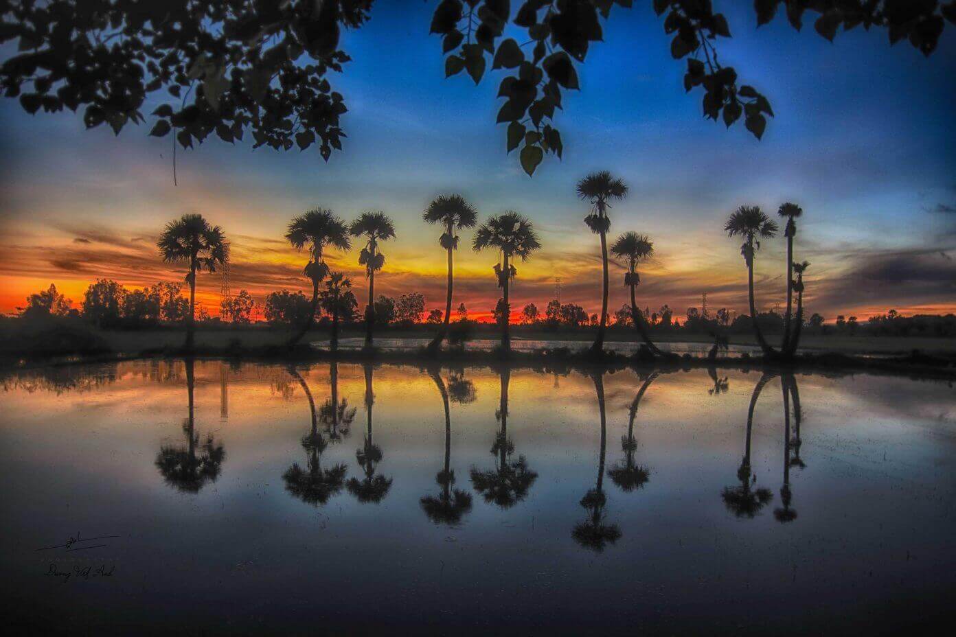 Hàng cây thốt nốt vươn cao,có cây lại uốn cong thân và khi chúng soi bóng mặt nước tạo nên cấu trúc đối xứng đẹp mắt. Ảnh: Dương Việt Anh
