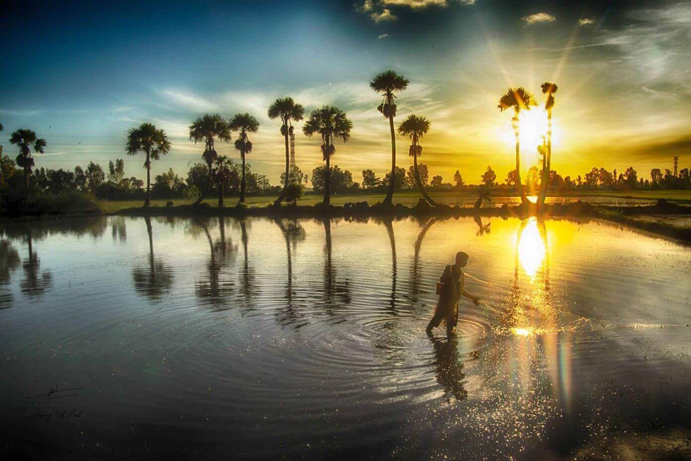 Sáng sớm,khi ánh mặt trời chiếu rọi qua hàng cây thốt nốt là lúc người dân sẽ bắt đầu đi gỡ lưới cá đồng. Ảnh: Dương Việt Anh