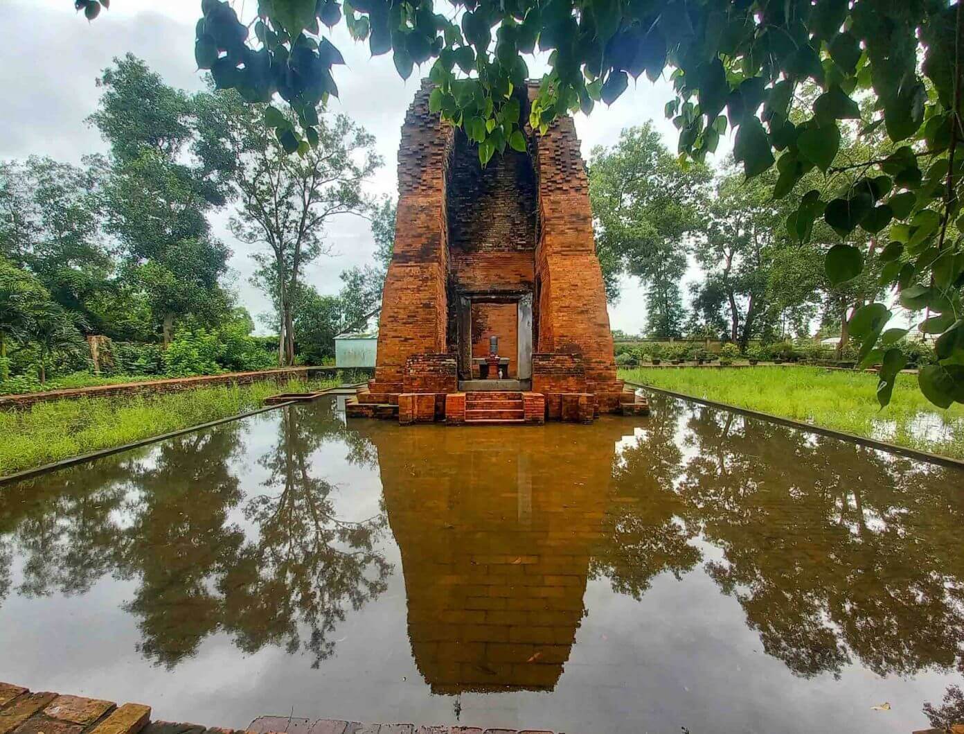 Đến đây,du khách sẽ dễ dàng ngôi tháp đứng giữa những tán cây,với dáng vẻ cổ kính – một phần bị rong rêu phủ,còn lại nhiều chỗ gạch loang lổ bởi thời gian dài chịu ảnh hưởng của mưa nắng.