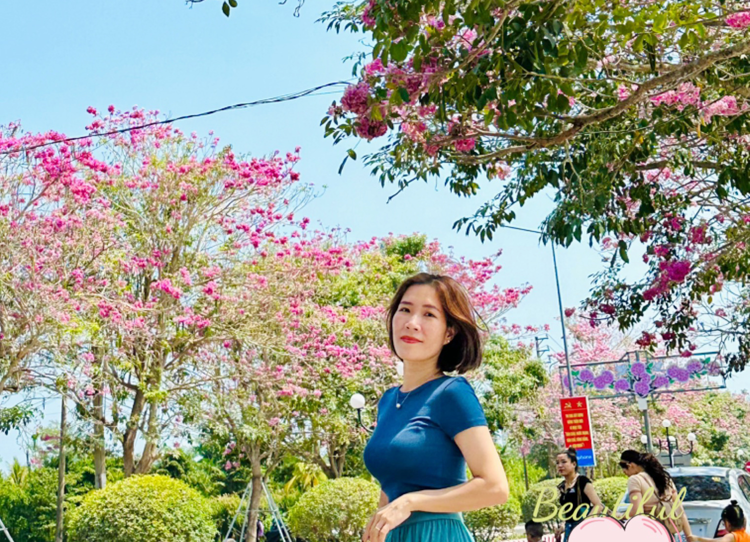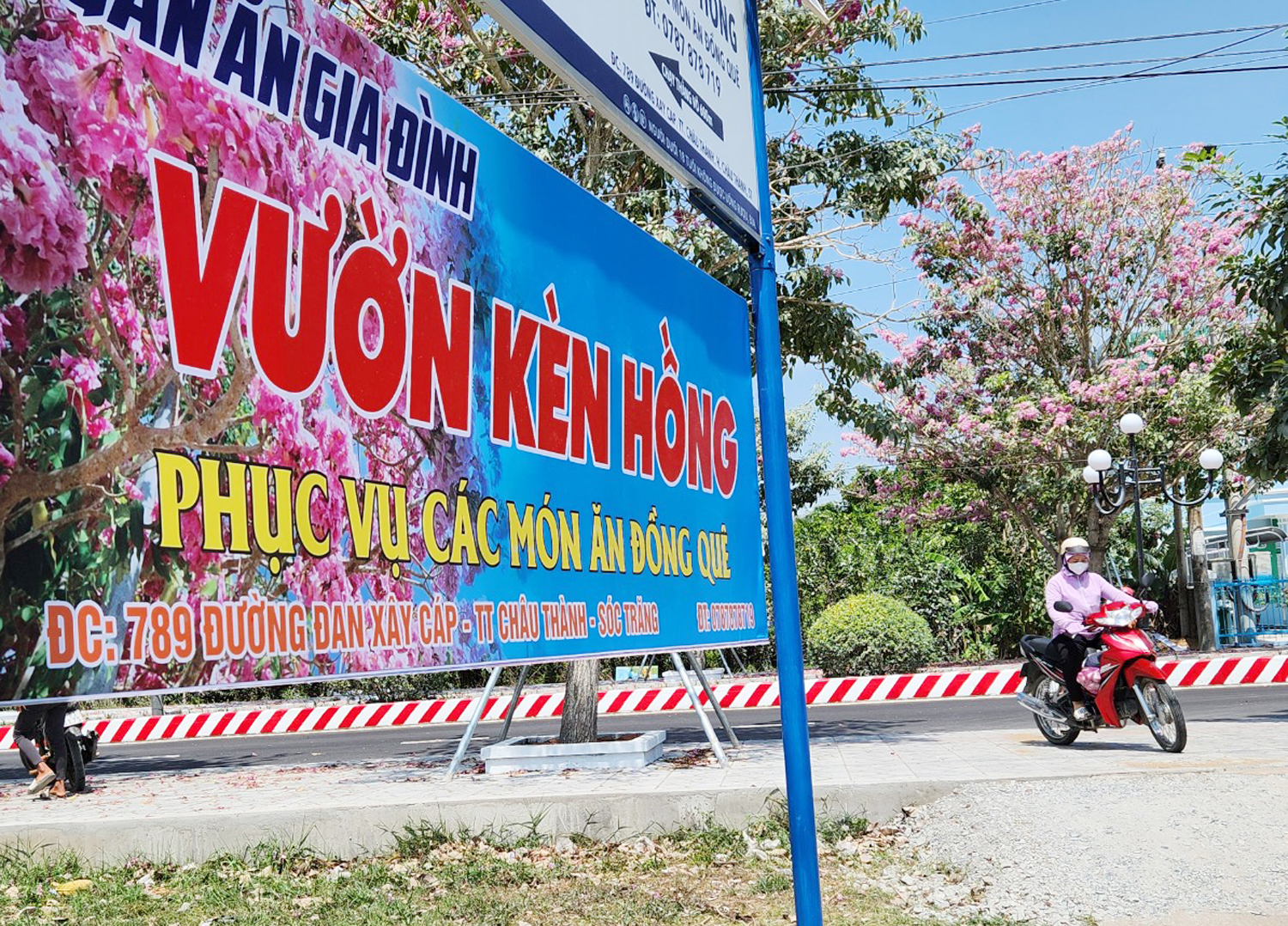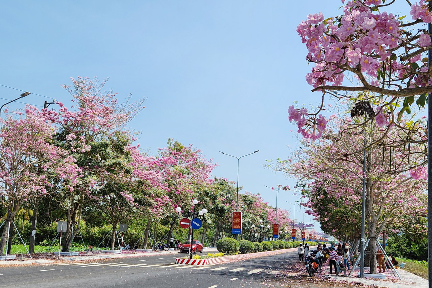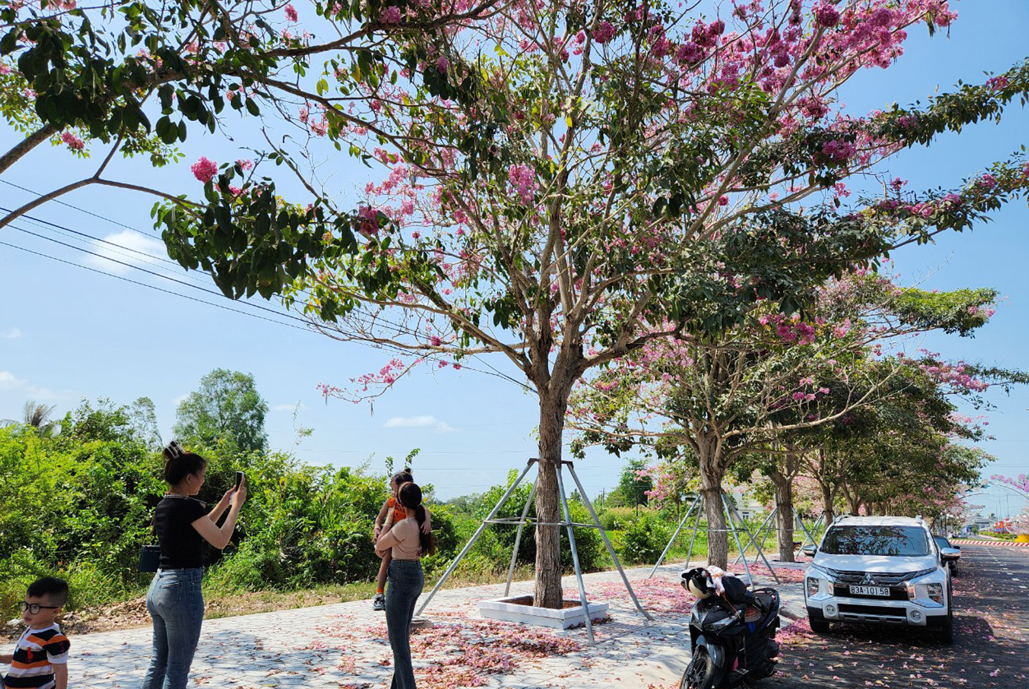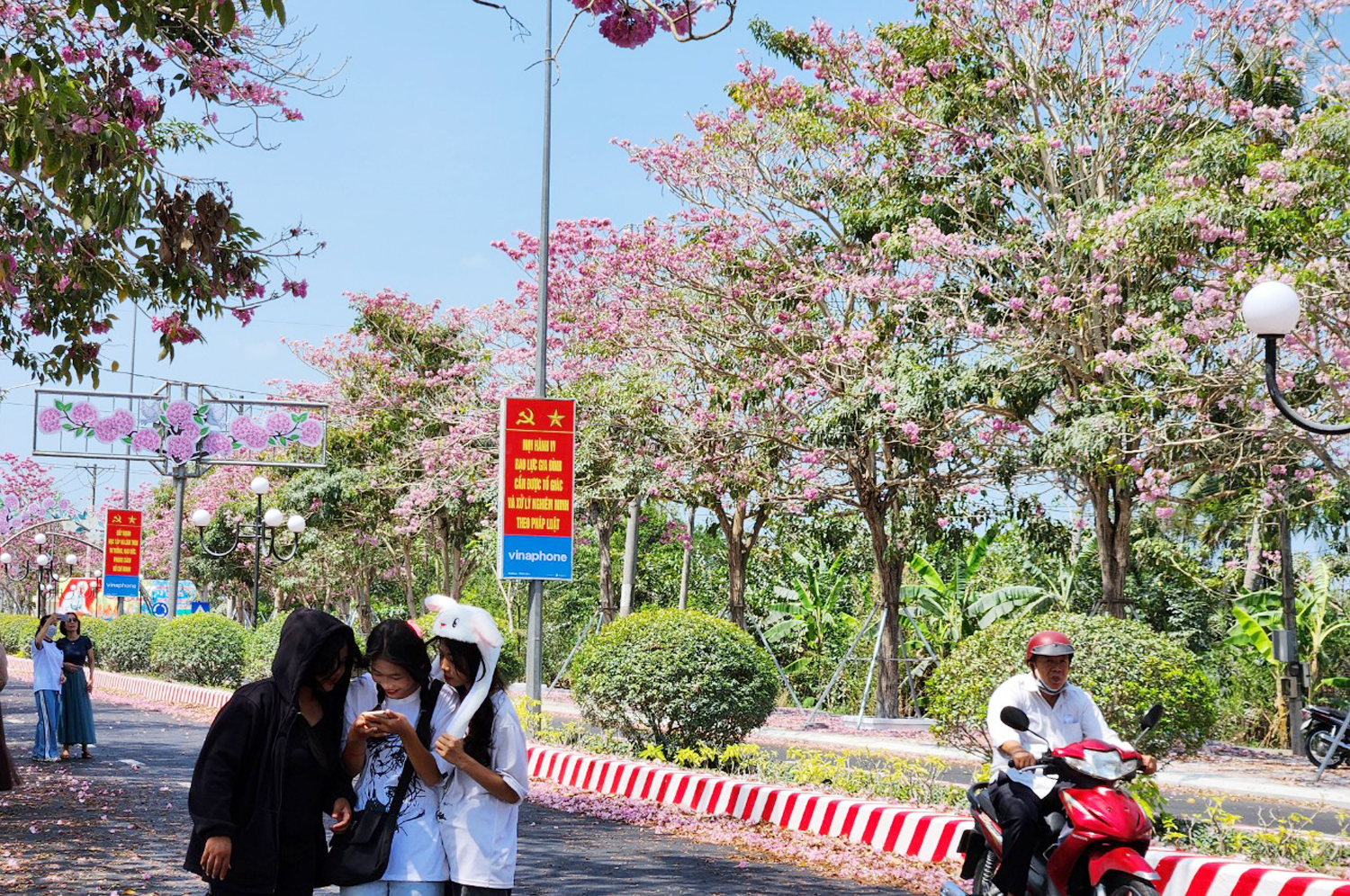 Từ cuối tháng 2 đến nay,đoạn đường gần 1 km từ quốc lộ 1 vào khu hành chính huyện Châu Thành (tỉnh Sóc Trăng) tấp nập du khách check-in hoa kèn hồng.