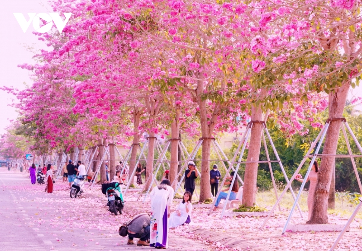 Gần 300 cây kèn hồng đã trổ hoa đồng loạt trên đường vào khu hành chính huyện Châu Thành,tỉnh Sóc Trăng. Mỗi ngày có hàng trăm người từ khắp các tỉnh khu vực Đồng bằng sông Cửu Long đến đây để chụp ảnh.