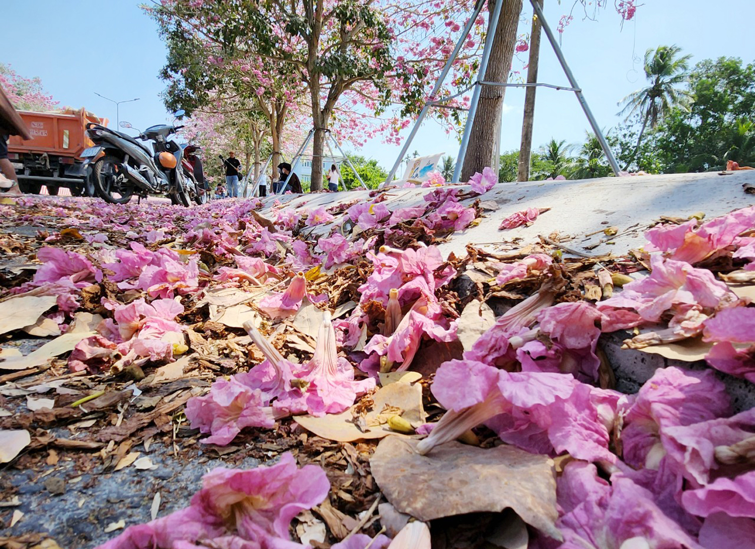 Những năm trước,kèn hồng trổ hoa vào trung tuần tháng 3 nhưng năm nay nắng nóng từ sau Tết Nguyên đán Giáp Thìn nên 282 cây kèn hồng 2 bên đường Hùng Vương,thị trấn Châu Thành (Sóc Trăng) đã trổ hoa từ một tuần trước. Nhiều cánh hoa bị gió giật rơi rụng xuống đường tạo nên cảnh đẹp như trong phim.