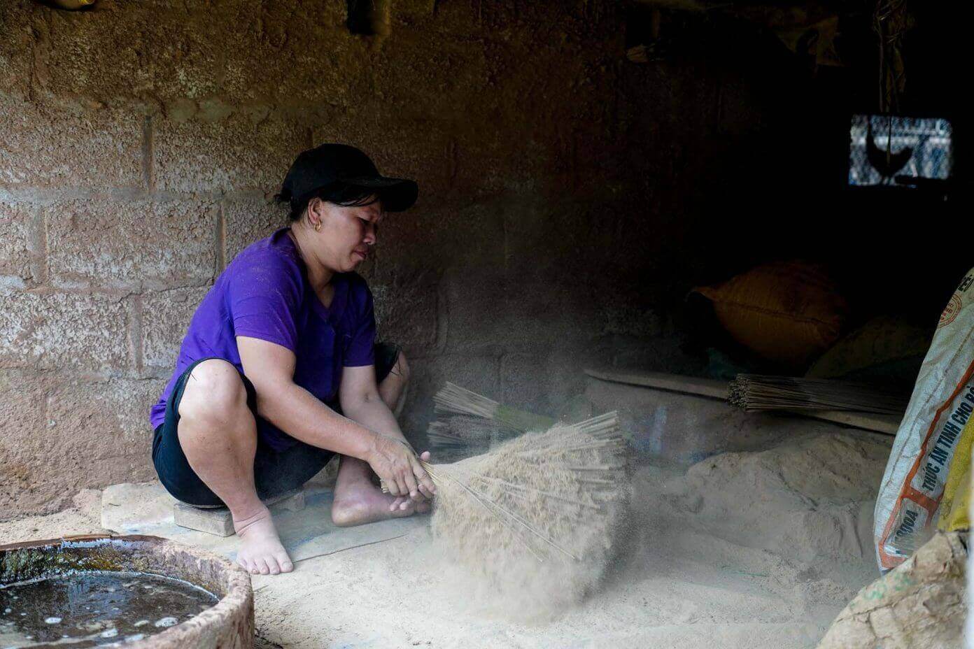 Người thì đi hái lá cây bầu hắt trên rừng về phơi khô,tán nhỏ để dùng làm chất keo kết dính. Còn có người lại đi gom vỏ cây nghiến đỏ,mùn cưa để làm bột hương hay tìm gỗ thông mục đem về nghiền nát thành bột để tạo màu.