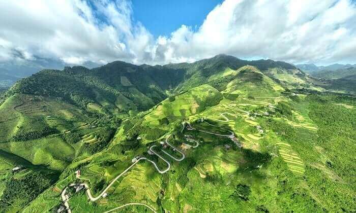 Từ trên cao nhìn xuống,ngọn đèo như một con đường ngoằn ngoèo uốn khúc,tựa một dải lụa mềm đang len lỏi qua những cánh đồng lúa,nương ngô và những mái nhà nhỏ bình yên của bà con bản địa.