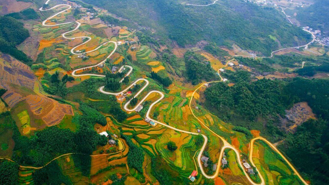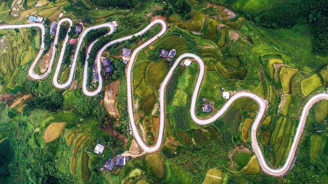 Xen kẽ cung đường là những thửa ruộng bậc thang, những mái nhà thấp thoáng cùng những cánh đồng ngô bạt ngàn lưng chừng đồi núi. Ảnh cắt từ clip