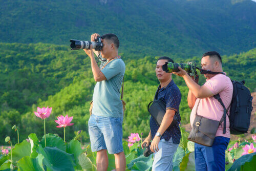 Các bạn trẻ hào hứng ghi lại hình ảnh đẹp bên cánh đồng sen.