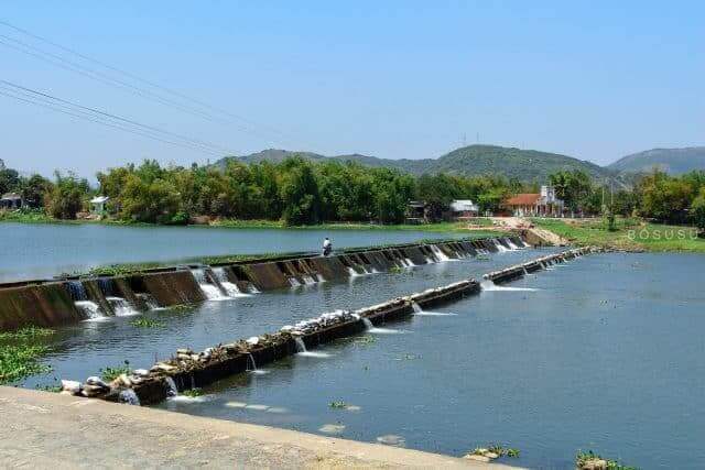 Đập Tam Giang nằm cách trung tâm thành phố Tuy Hòa khoảng 30km, cách nhà thờ Mằng Lăng – 1 trong những địa điểm du lịch nổi tiếng của Phú Yên chừng 1km, là một đập tràn chắn ngang sông Cái. Ở nơi 3 dòng sông gặp nhau thông thường người ta gọi là Tam Giang nhưng ở đây lại chỉ có duy nhất một dòng sông chảy qua. Trước năm 1945, khi chưa có đập, người dân địa phương đã rất vất vả trong việc đưa nước về đồng ruộng, họ phải lặn lội lên những cánh rừng tìm những cây gỗ to nhất đem về đặt chắn ngang sông. Nhưng đến mùa mưa, nước lũ chảy xiết, những cây gỗ kè tạm bợ này lại bị cuốn trôi mất. Và những năm sau, công việc đó cứ lặp đi lặp lại. Sau đó, chính quyền đã cho xây dựng một con đập dài khoảng 800m bằng xi măng vững chãi với thiết kế tam bậc, có 3 bờ kè chắn nước. Nhìn từ xa, đập Tam Giang như một ngọn thác với những dòng nước chảy xuống tung bọt trắng xóa. Mặc dù quy mô không được lớn như đập Đồng Cam nhưng đập Tam Giang có vai trò rất quan trọng trong việc đưa nước tưới tiêu về cho các cánh đồng bát ngát ở xã An Thạch, An Ninh và An Dân của huyện Tuy An. Hơn nữa, con đập này cũng giúp ích rất nhiều khi trở thành con đường nối 2 bên bờ sông. Người dân có thể đi bộ hoặc đi xe đạp, xe máy ngang qua sông Cái một cách dễ dàng mà không phải đi thuyền qua sông, giúp tiết kiệm thời gian và công sức. Nhờ có đập Tam Giang mà việc đi lại giữa 2 bờ trở nên thuận tiện hơn (Ảnh: Sưu tầm) Đến đây, bạn sẽ cảm nhận được một không gian yên bình, lặng ngắm những con người nơi miền quê sông nước mà thấy mình như trút bỏ được mọi lo âu, mệt nhọc của cuộc sống. Không chỉ được đắm mình vào thiên nhiên sông nước hữu tình, khi đến đây bạn còn được thưởng thức những món ăn đặc sản hấp dẫn. Cá chình sông Cái là món ăn bạn không nên bỏ qua. Thịt cá chình chắc, thơm, da giòn, dai và béo với giá trị dinh dưỡng cao. Cá chình sông Cái thường được chế biến thành các món như lẩu cá chình, cá chình nướng lá chanh, cá chình nấu dưa, cá chình rang muối ớt,… Đập Tam Giang không chỉ là một công trình thủy lợi quan trọng của huyện Tuy An mà nó còn là một điểm du lịch hấp dẫn du khách bởi vẻ đẹp hoang sơ, mộc mạc như chính những con người nơi đây.