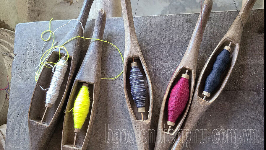 Những cuộn chỉ màu dùng để dệt chân chân váy và các bộ phận cần hoa văn cầu kỳ (ảnh nhỏ).