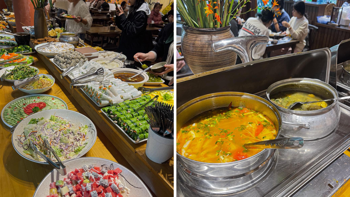 Điểm nhấn chính của nhà hàng chắc chắn là quầy line buffet với số lượng món ăn ấn tượng. Thực đơn tại đây có thể lên đến hơn 50 món chay đa dạng,được thay đổi luân phiên. Nhà hàng rất chú trọng vào việc tự chế biến thủ công các món ăn. Họ cam kết sử dụng nguồn nguyên liệu tươi ngon,được nhập mới mỗi ngày.