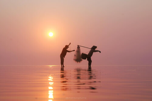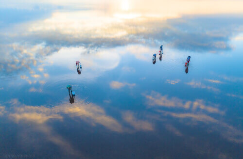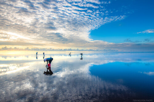 Đặc biệt,khi thủy triều xuống,nước biển còn cao đến mắt cá chân,đường chân trời dài hàng chục km tạo nên một khung cảnh rất “ảo” và rất “chill”.