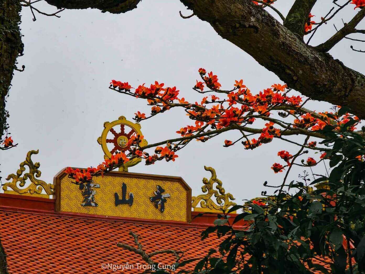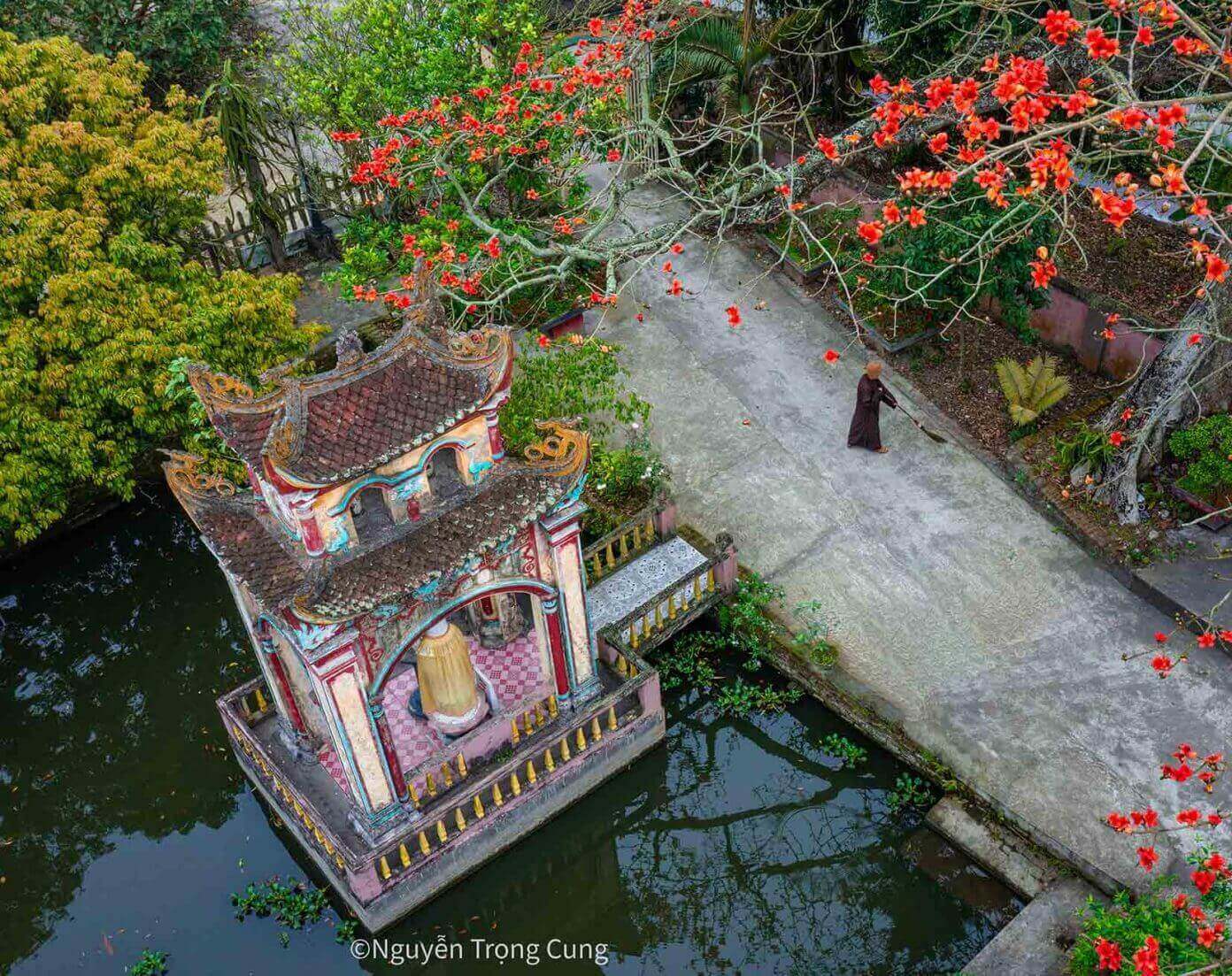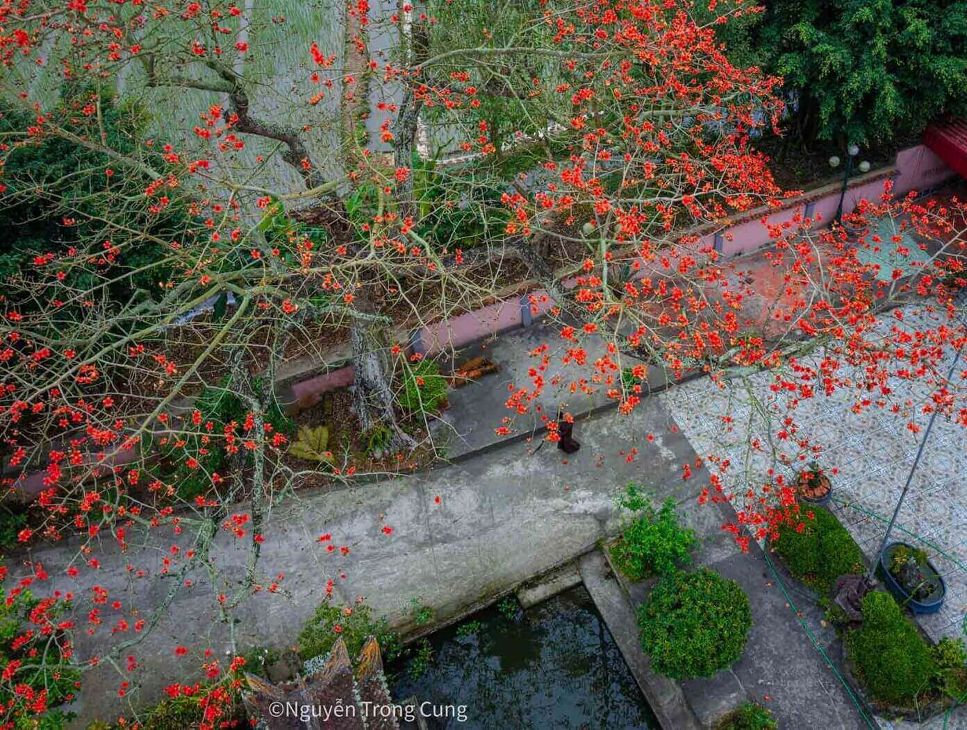 Cây hoa gạo nở đỏ rực một góc sân,trong khung cảnh chùa chiền và đồng ruộng. Anh Cung cảm nhận được sự thanh tịnh,yên tĩnh nơi cửa Phật. Ảnh: Nguyễn Trọng Cung