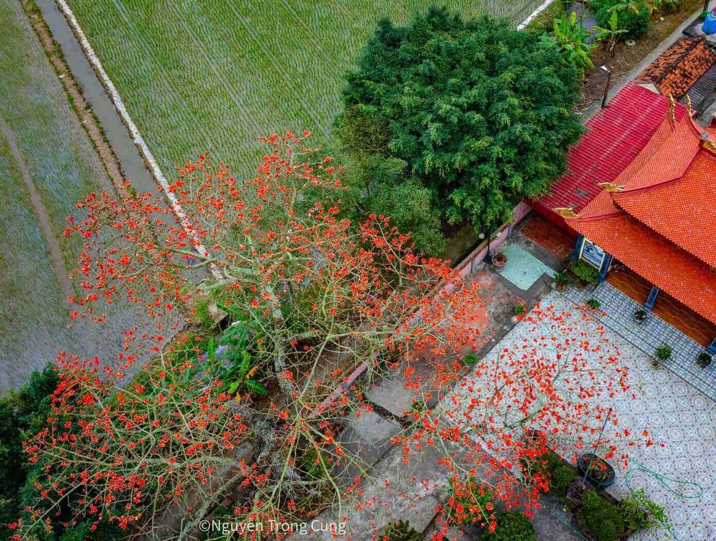 Hoa gạo thường nở vào trung tuần tháng Ba và kéo dài trong khoảng hai tuần. Theo anh Cung,bên cạnh chùa Linh Sơn,điểm chụp hoa gạo đẹp nhất Thái Bình hiện tại là ở đình Ngái,thuộc xã Quang Bình,huyện Kiến Xương. Ảnh: Nguyễn Trọng Cung