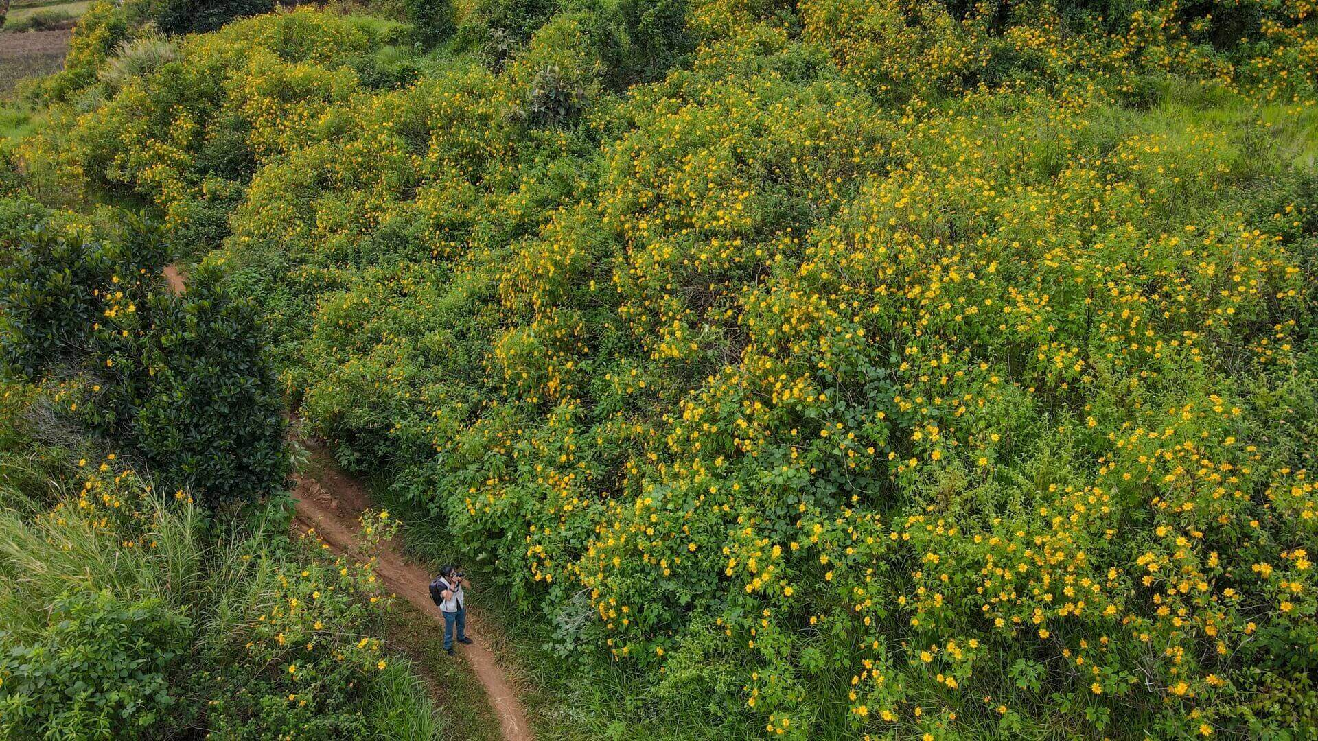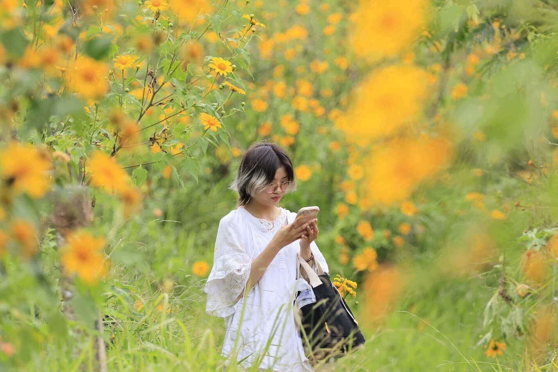 Một bạn sinh viên khoa Quan hệ công chúng Trường Đại học Yersin Đà Lạt tranh thủ đi ngắm hoa và ghi lại vẻ đẹp của loài hoa dã quỳ để làm video giới thiệu trên mạng xã hội