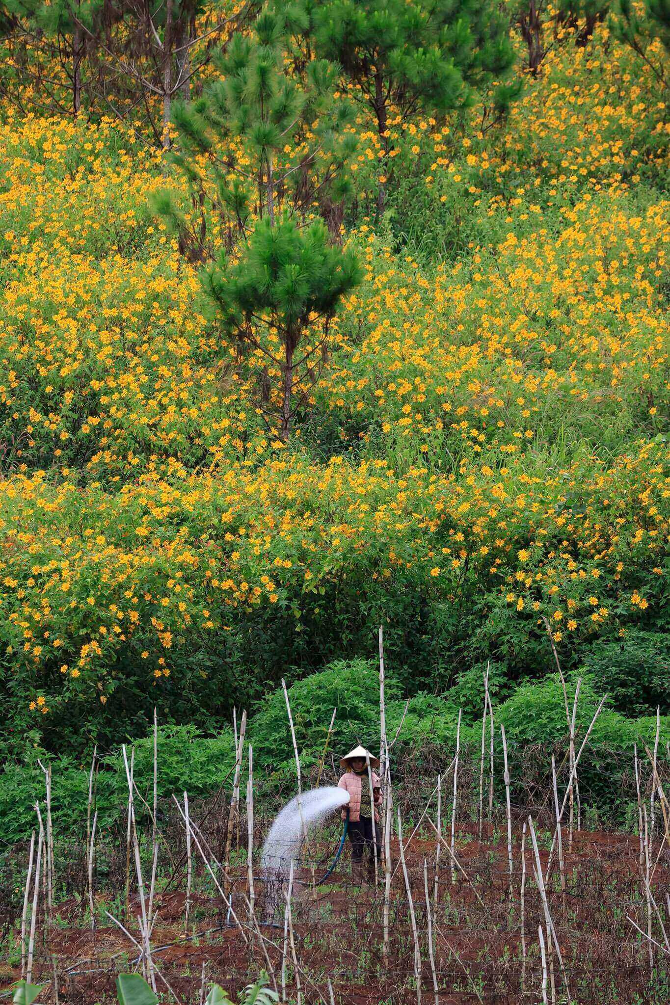 Khung cảnh rực rỡ của loài hoa dại được người dân trồng làm hàng rào ngăn cách với vườn rau ở vùng ngoại ô Đà Lạt