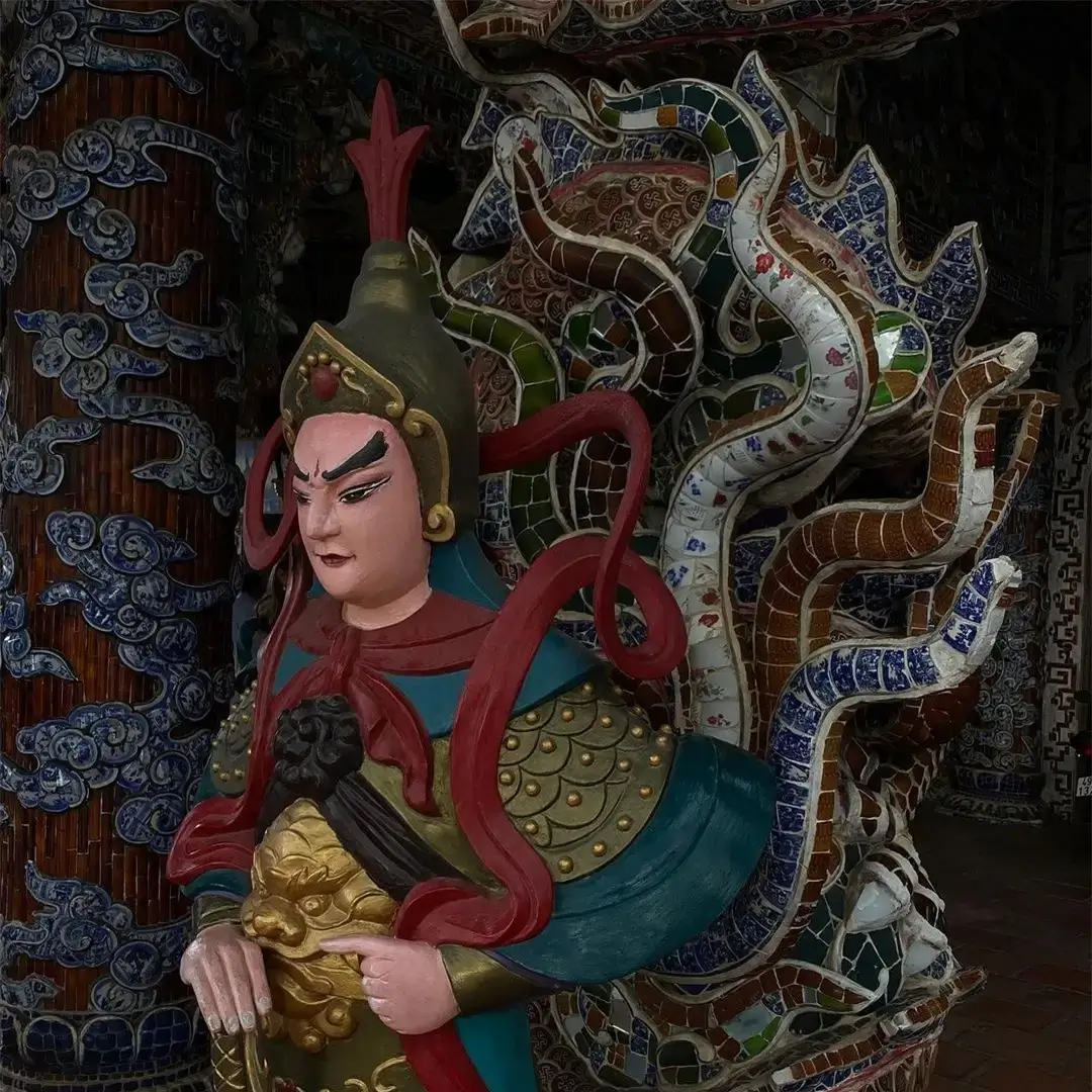 Nhìn từ cổng vào bên trong,chùa được đính kết từ hàng triệu mảnh chai sành,gốm,sứ các loại với đủ màu sắc,kích cỡ và chất liệu khác nhau,tạo nên tổng thể vô cùng độc đáo. Cũng vì thế mà chùa còn có tên gọi là chùa “ve chai” để du khách dễ dàng phân biệt với những ngôi chùa khác tại Đà Lạt.