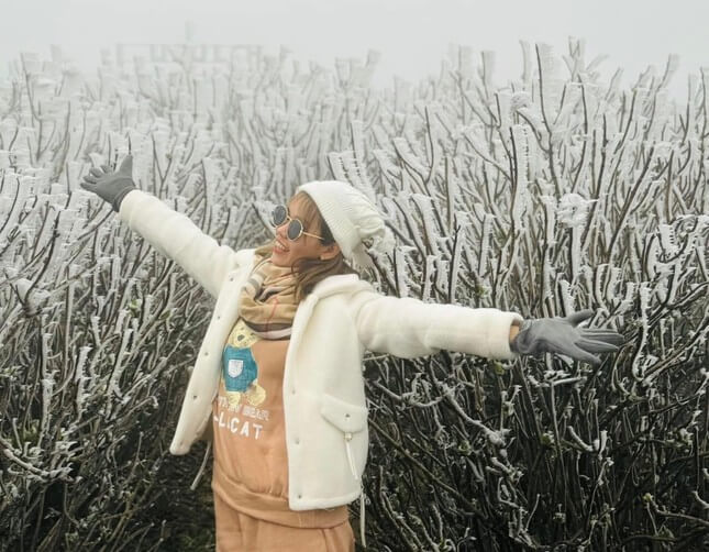 Du khách thích thú check-in với rặng cây phủ đầy băng. Ảnh: Dương Thị Dung.