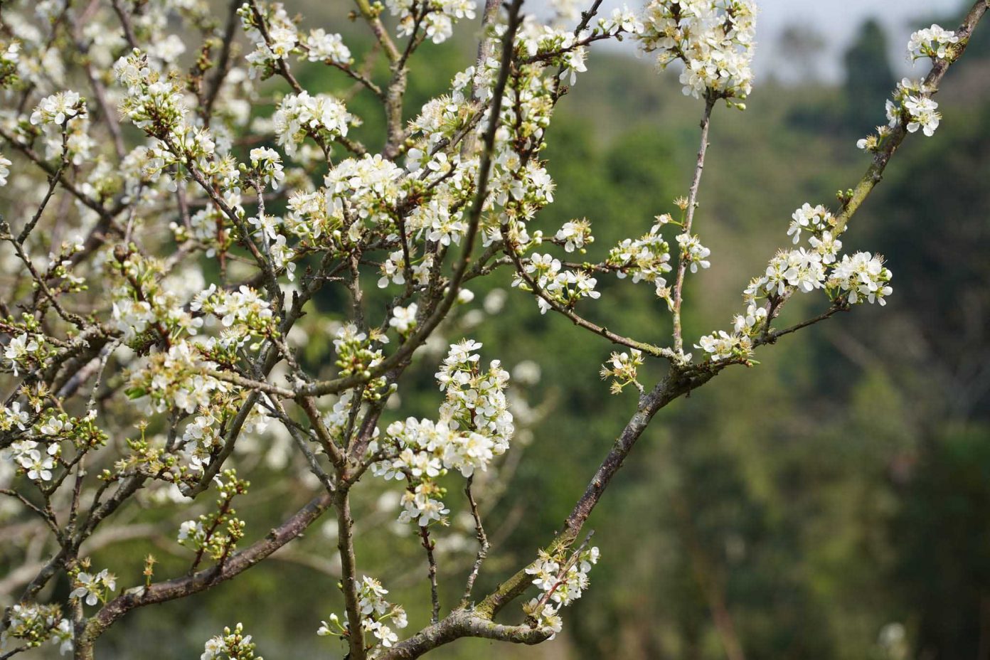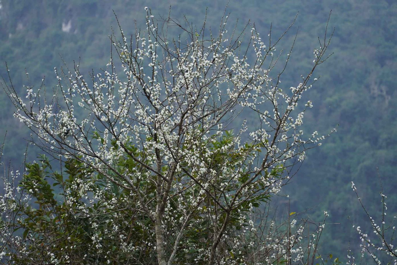 Hoa mận nở thành chùm dày,cánh hoa mỏng ôm lấy nhụy vàng. Các gốc mận xù xì nhưng đến mùa hoa nở mang lại vẻ đẹp riêng cho “thảo nguyên xanh” Đồng Lâm. Ảnh: Hoàng Vũ