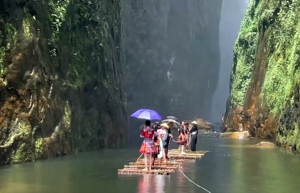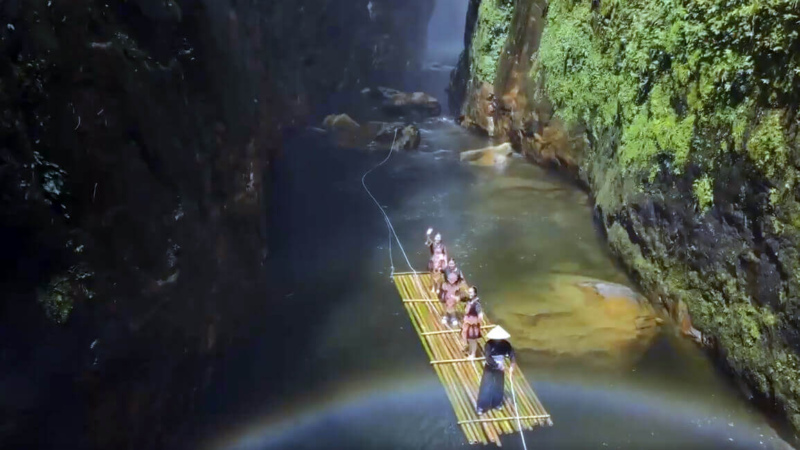 Để đưa du khách vào tham quan thác,người dân làm những chiếc bè kèm dây kéo.