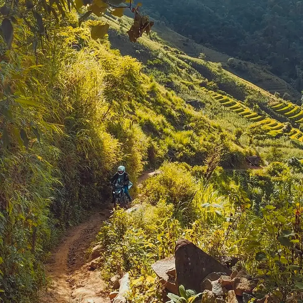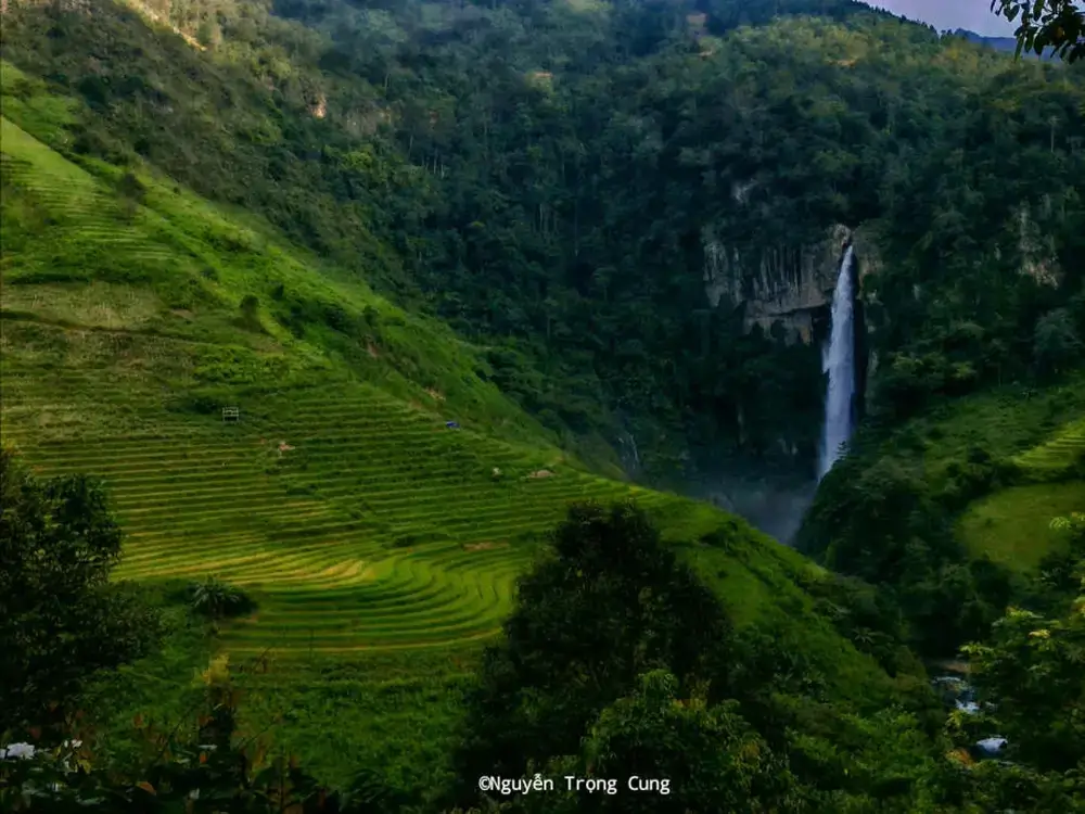 Đi hết chặng đường này,ngọn thác Háng Tề Chơ sẽ dần hiện ra,nhỏ như sợi chỉ được thả xuống từ đỉnh núi. Đây cũng là lúc quãng đường đi xe máy kết thúc,du khách cần gửi xe ở bản để tiếp tục đi bộ xuống thác.