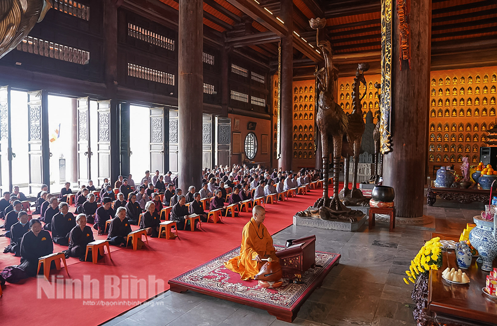 Ngày mùng một đầu tháng, hàng trăm tăng ni, phật tử cùng Thượng tọa Thích Minh Quang tụng kinh tại điện Tam Thế chùa Bái Đính.