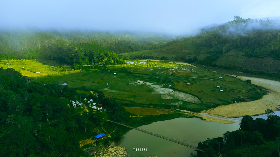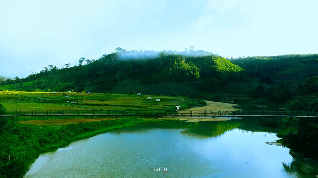 Để đến cánh đồng,người dân và du khách phải đi qua một chiếc cầu treo. Ảnh: Thái Tài