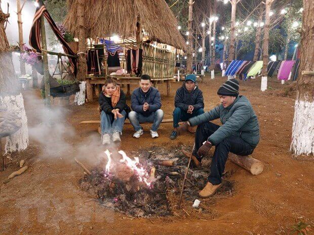 Du khách trải nghiệm Không gian văn hóa Thiên đường Tây Nguyên tại thị trấn Măng Đen,huyện Kon Plông,tỉnh Kon Tum) với nhiều vật dụng gắn với đời sống thường ngày của người dân tộc thiểu số nơi đây. (Ảnh: Khoa Chương/TTXVN)