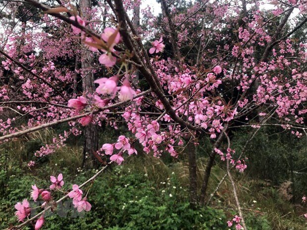 Hoa Anh đào tại thị trấn Măng Đen,huyện Kon Plông,tỉnh Kon Tum đồng loạt bung hoa,khoe sắc vào đúng ngày đầu Năm Mới 2022. (Ảnh: Khoa Chương/TTXVN)