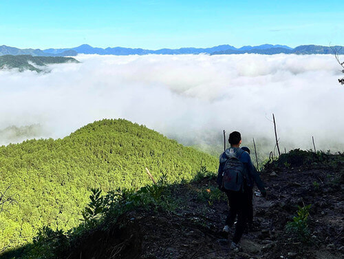 Từ khu vực đồi cỏ,du khách di chuyển men theo con đường mòn độc đạo xuyên qua núi,tốn chừng 30 phút là đến đồi sim Bùi Hui.