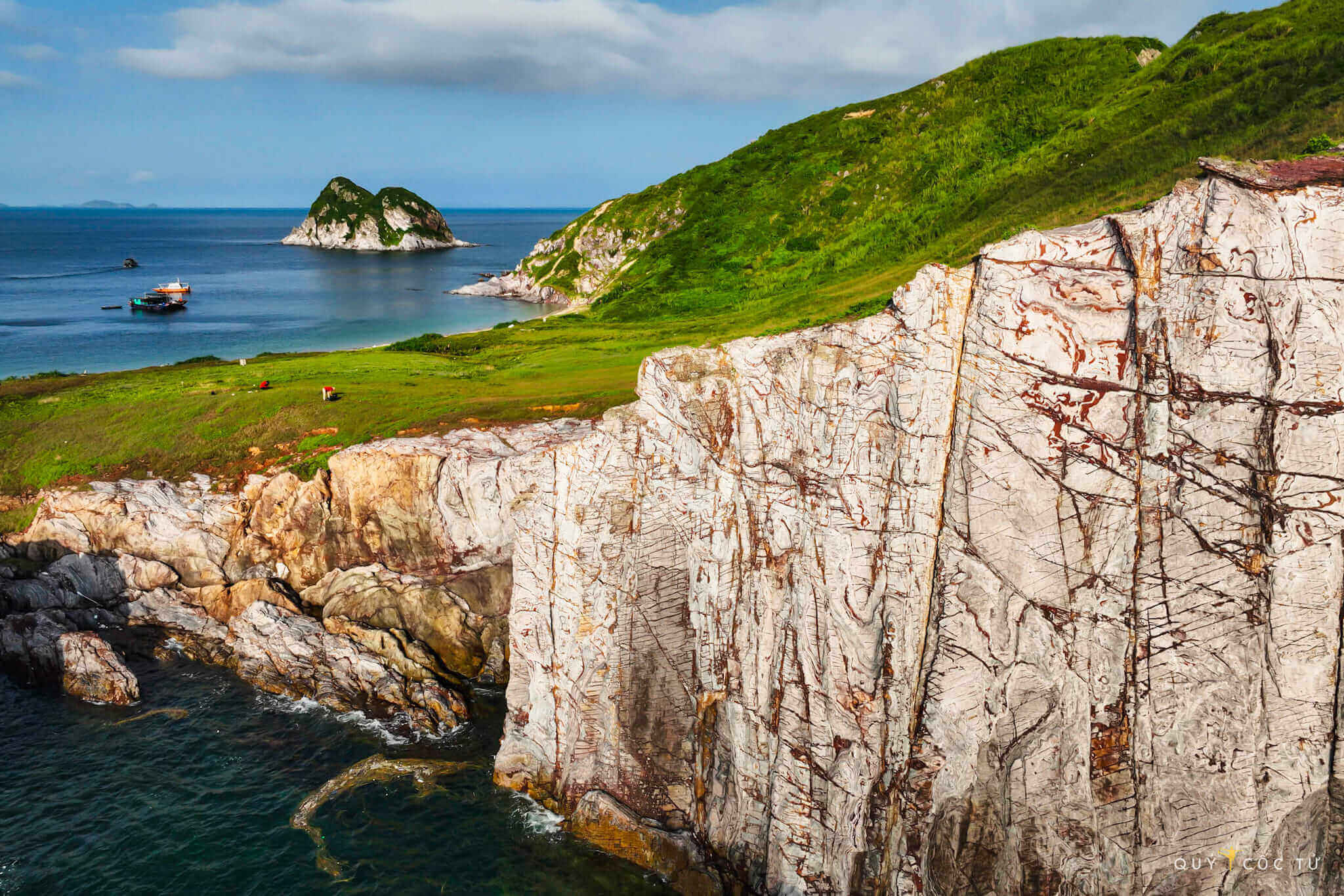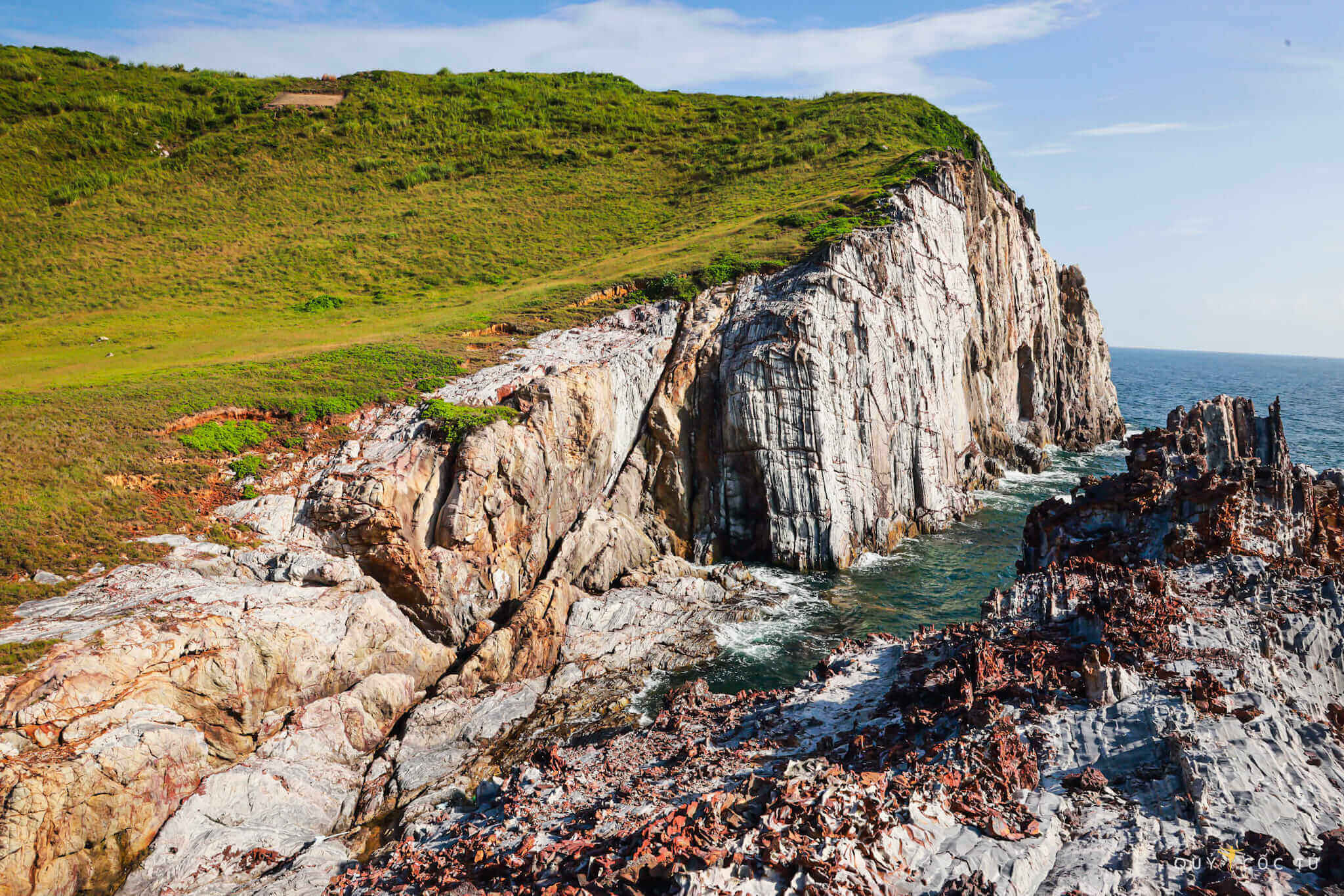 Từ nơi cao nhất của đảo,các vách đá giảm dần độ cao theo hai hướng để tạo thành hình cánh cung độc đáo.