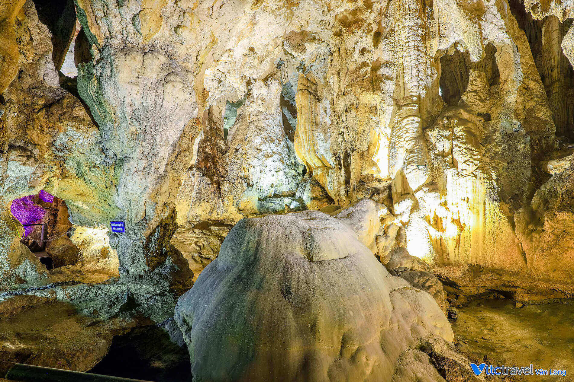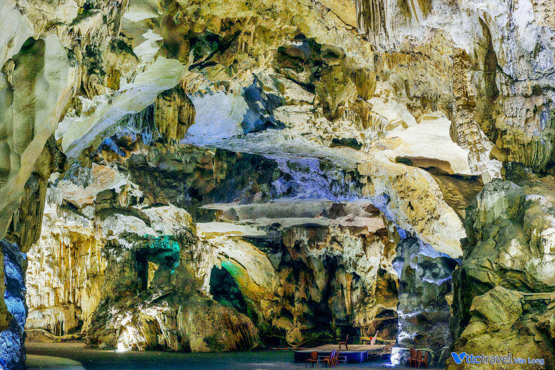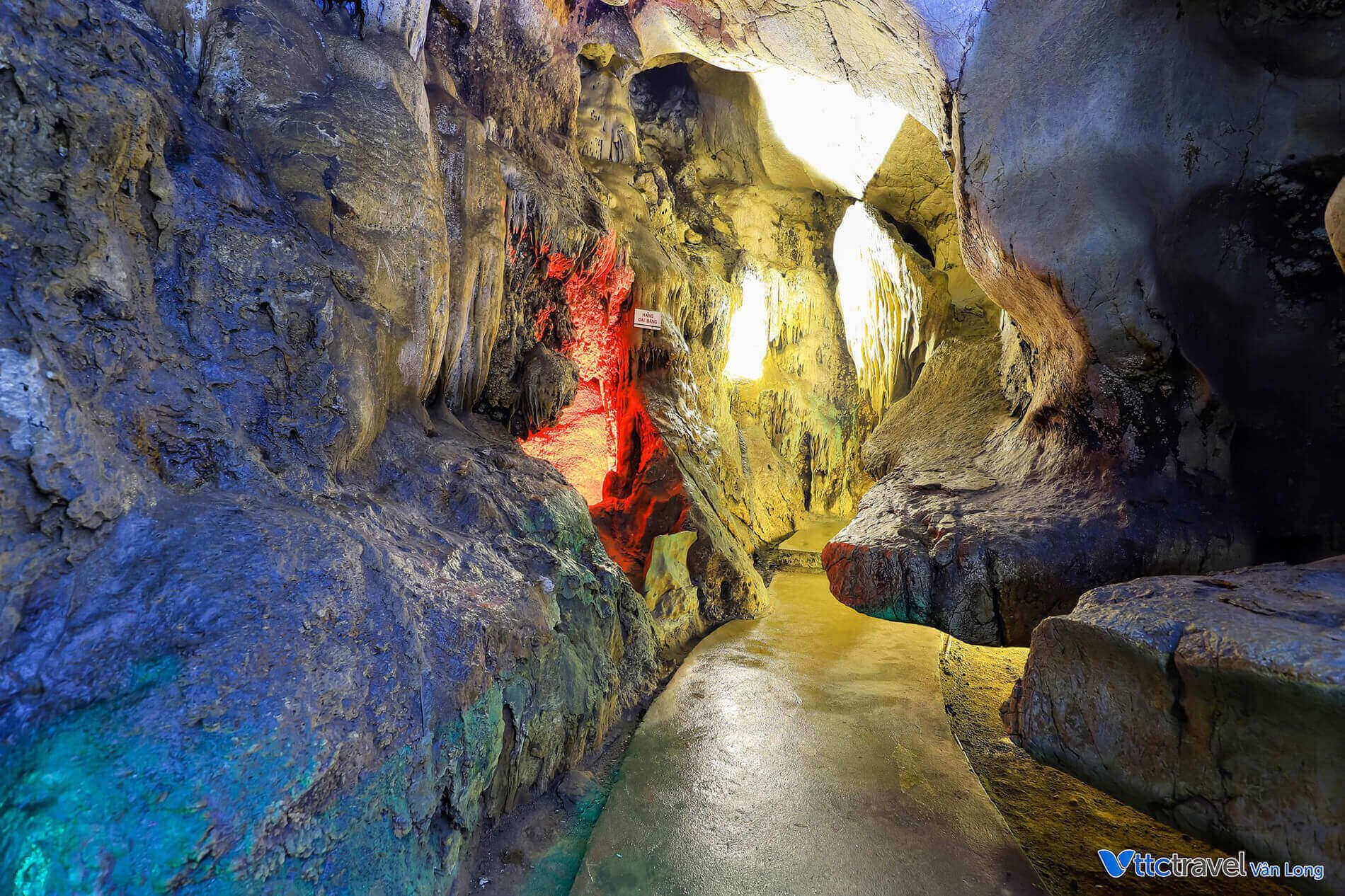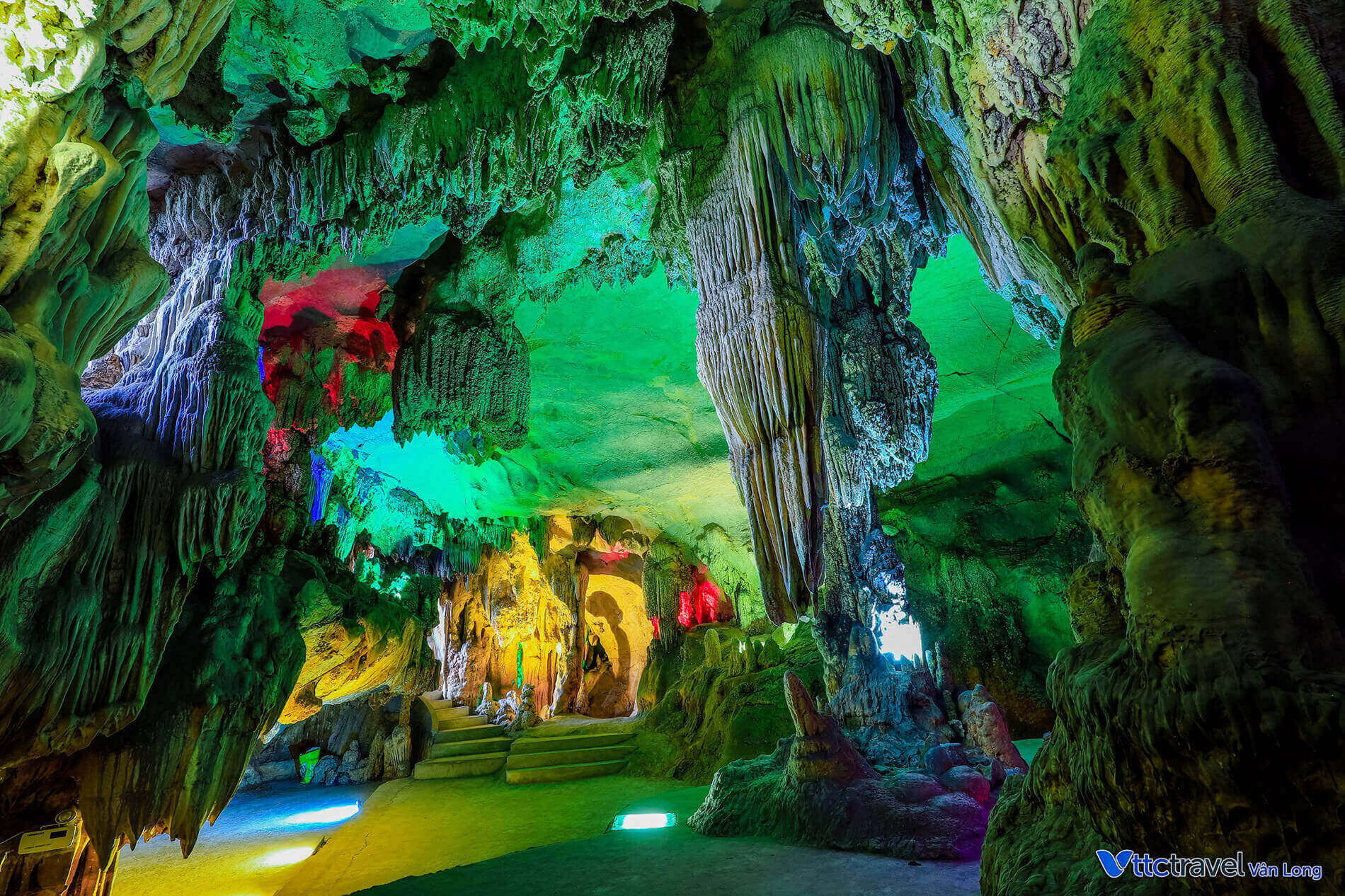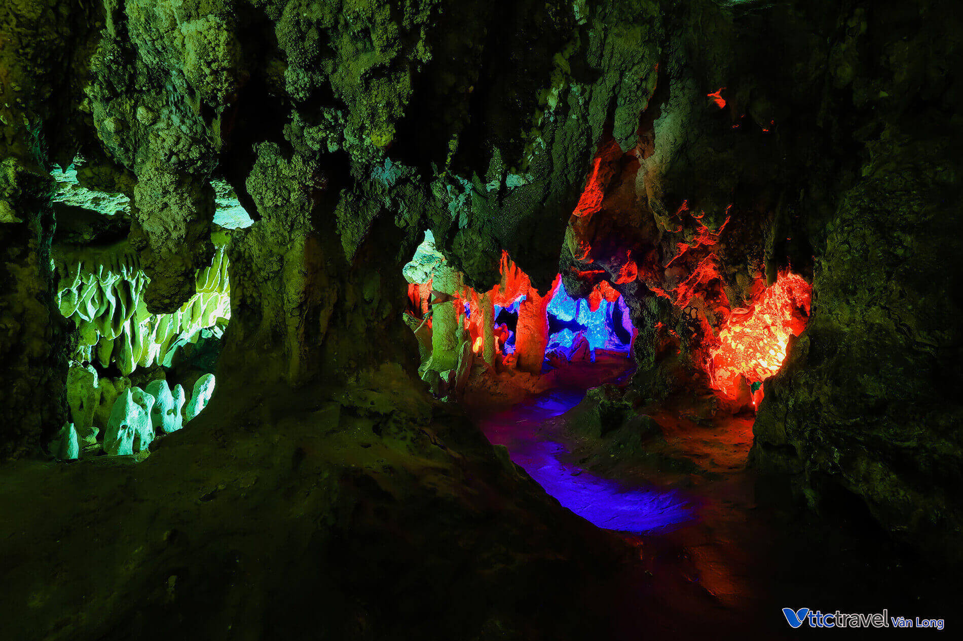 Hệ thống đèn chiếu sáng nhiều màu kết hợp cùng những khối nhũ đá đa dạng hình thù tạo cho các hang động vẻ kỳ bí,huyền ảo