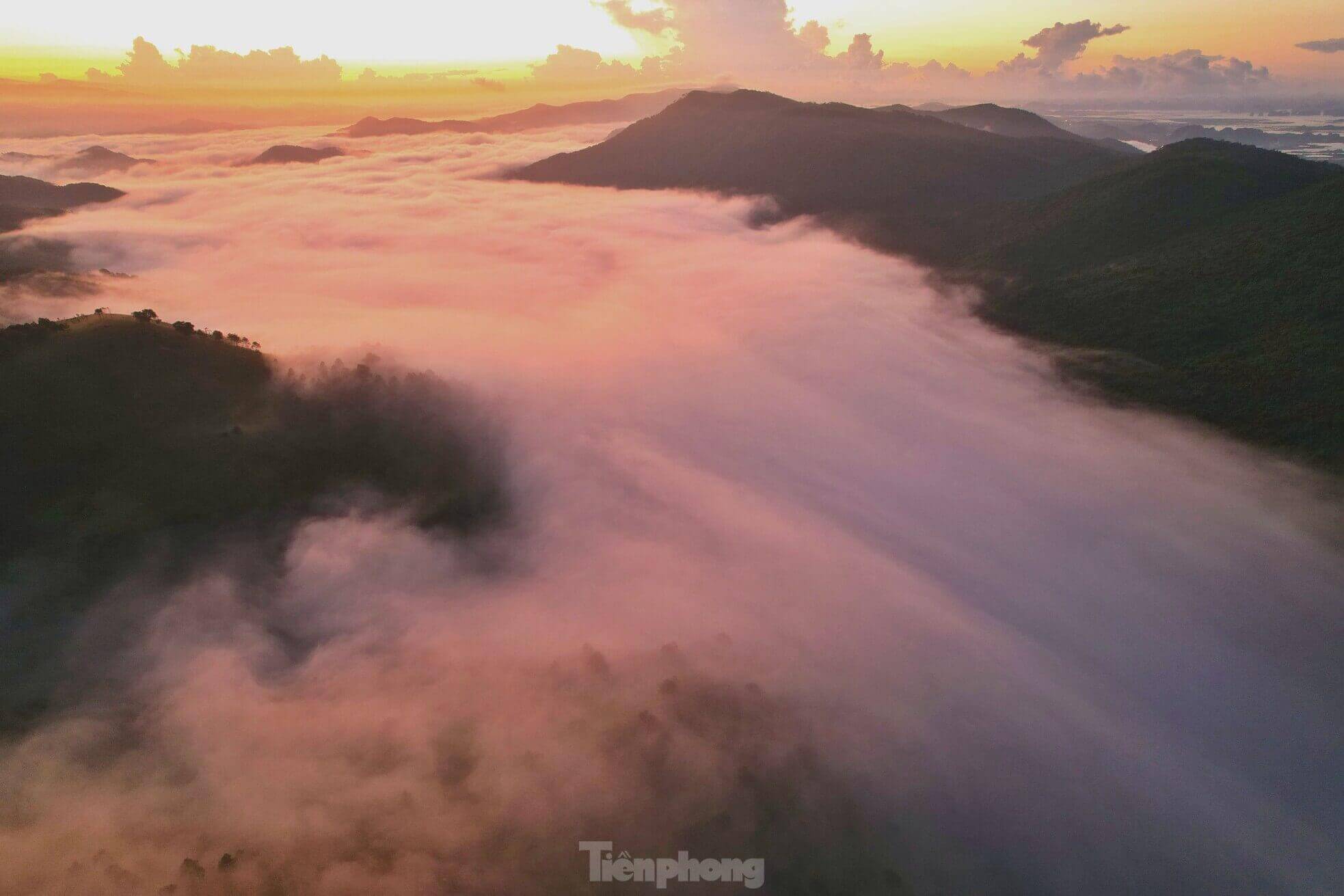 Cảnh mây vờn núi,luồn qua những tán cây phía chân đồi trước bình minh,như lạc vào chốn bồng lai tiên cảnh.