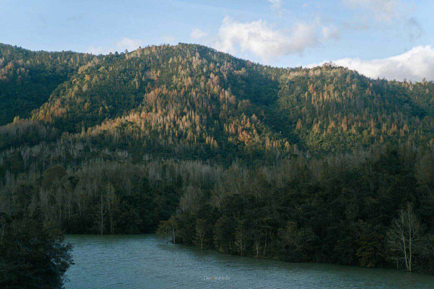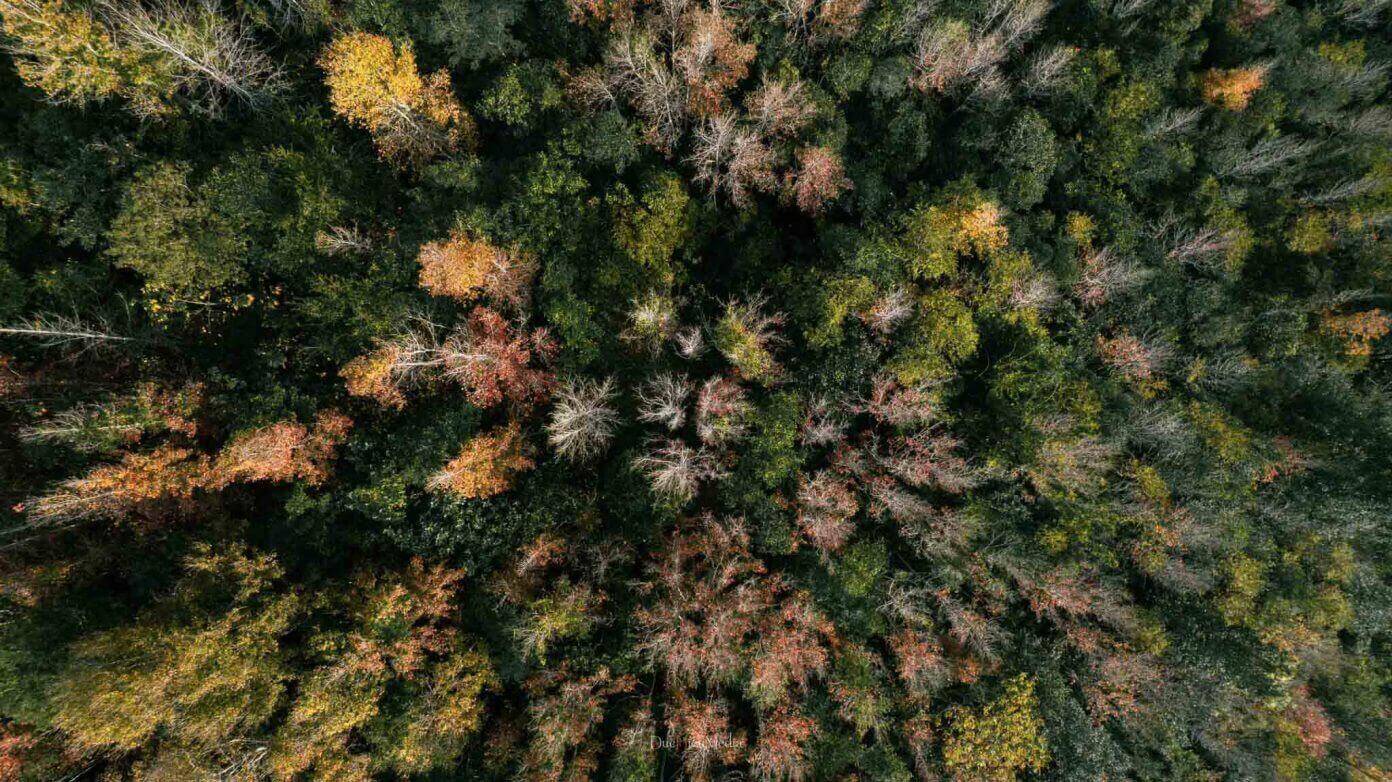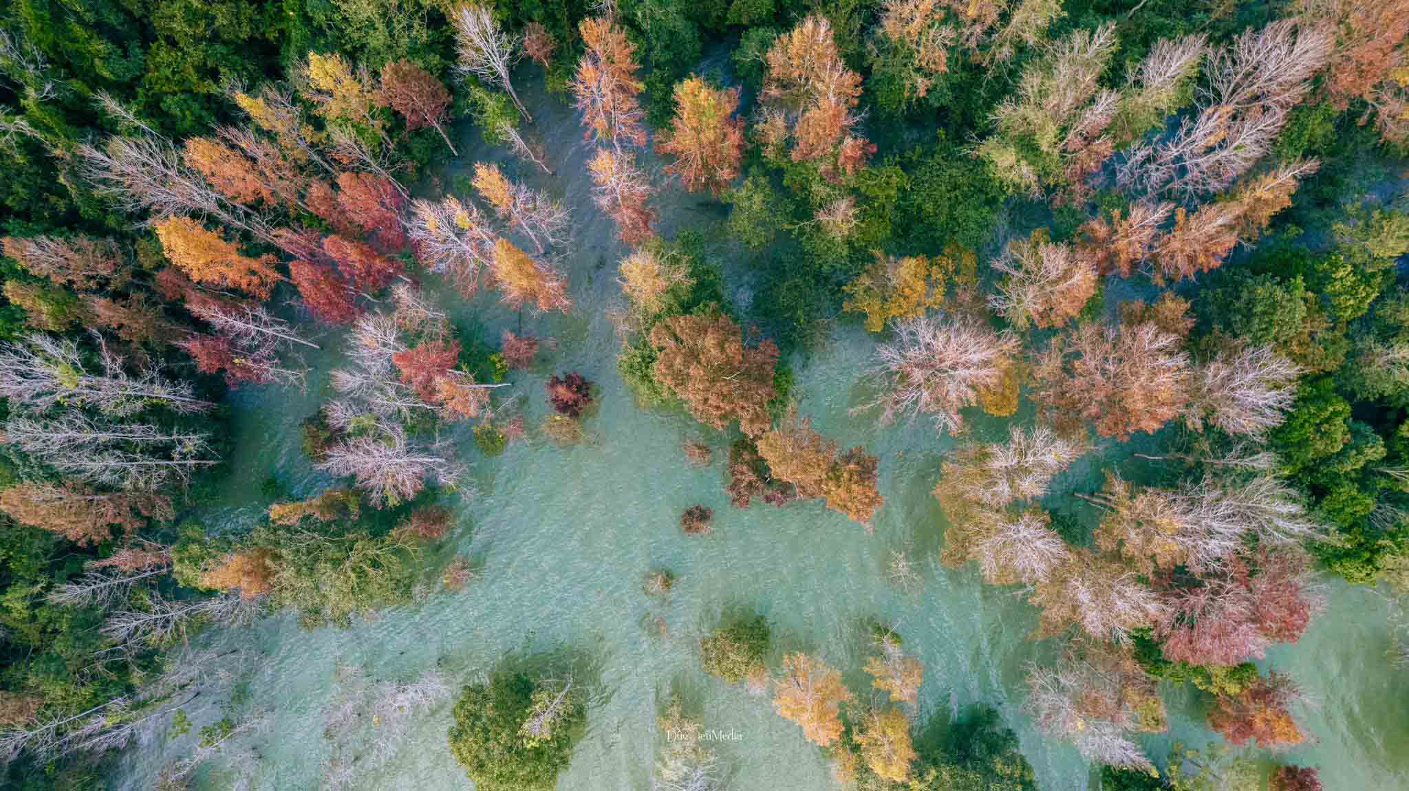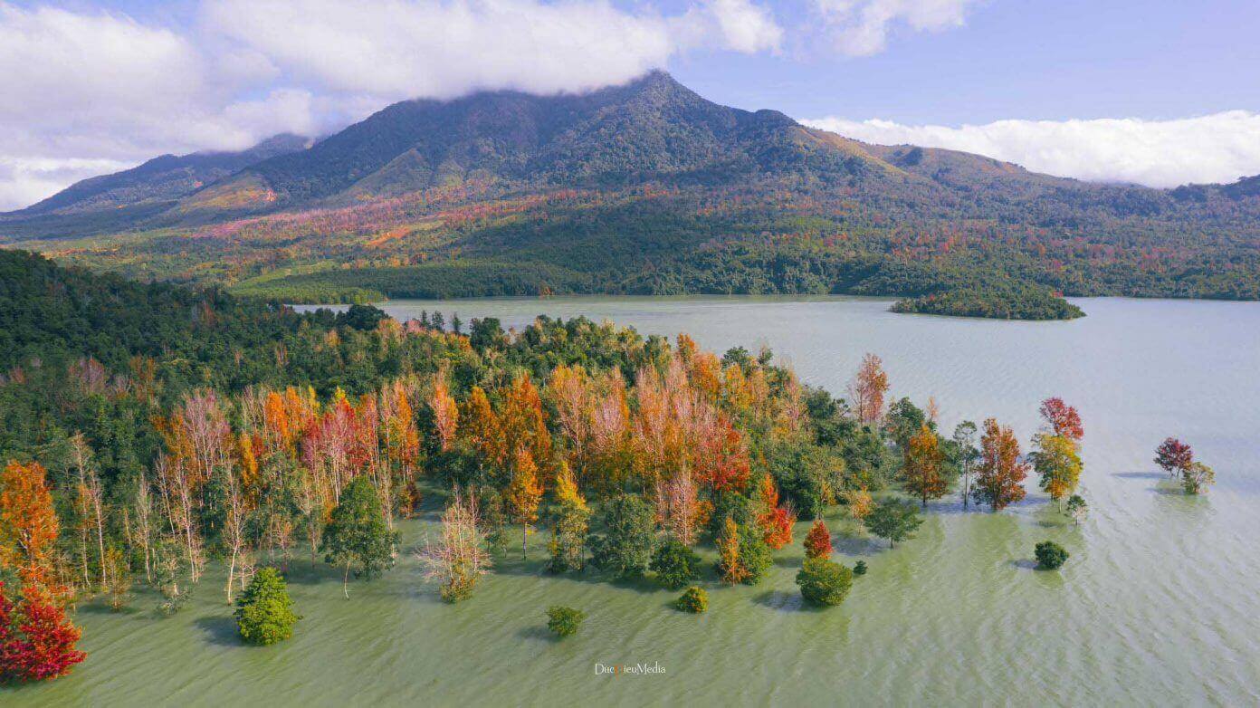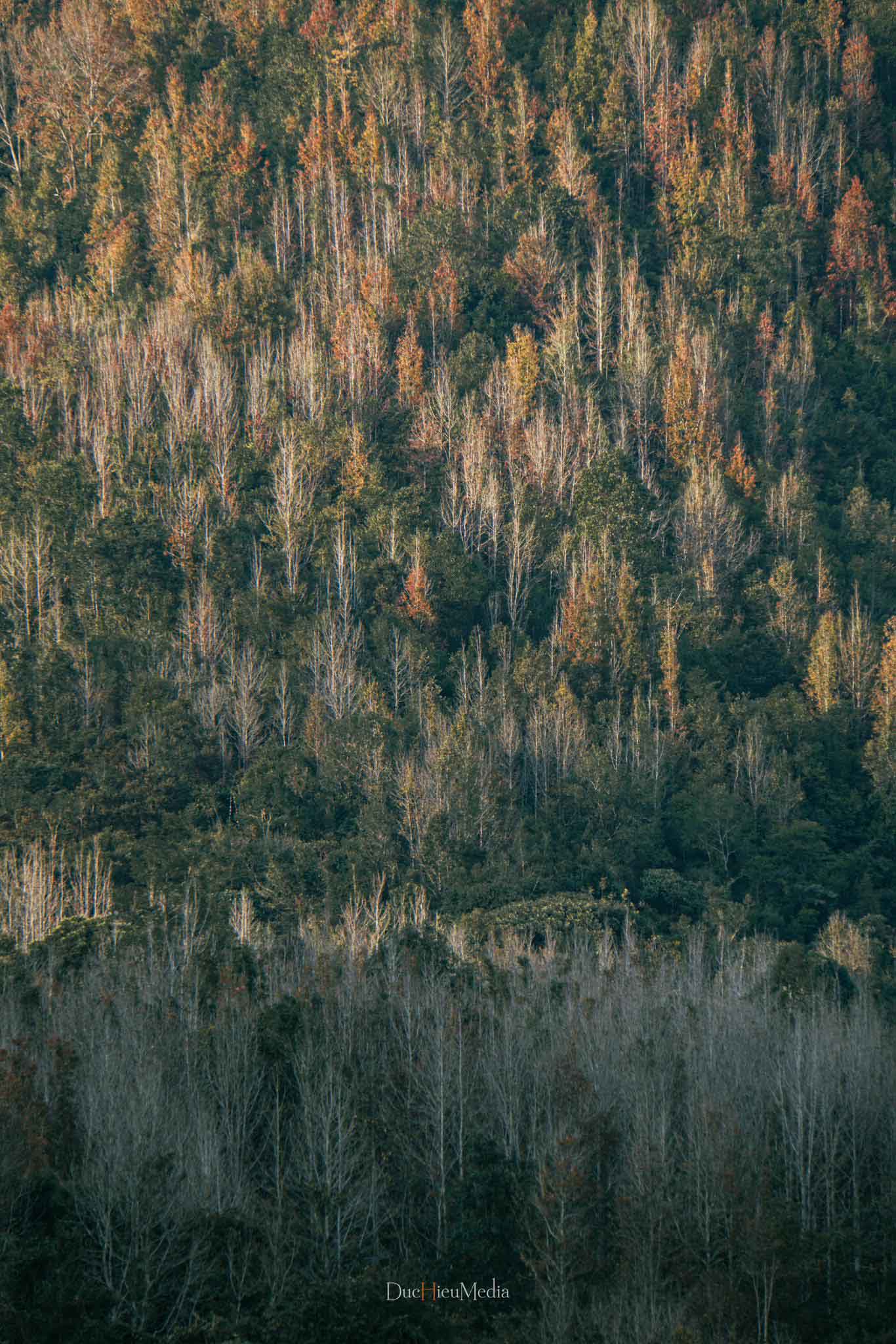 Khung cảnh rừng sau sau nhìn từ trên cao đầy ấn tượng bởi sắc là đỏ,cam,xanh và cả những cây sau sau đã rụng lá màu trắng xám,xen kẽ vào nhau. Ảnh: DucHieumedia