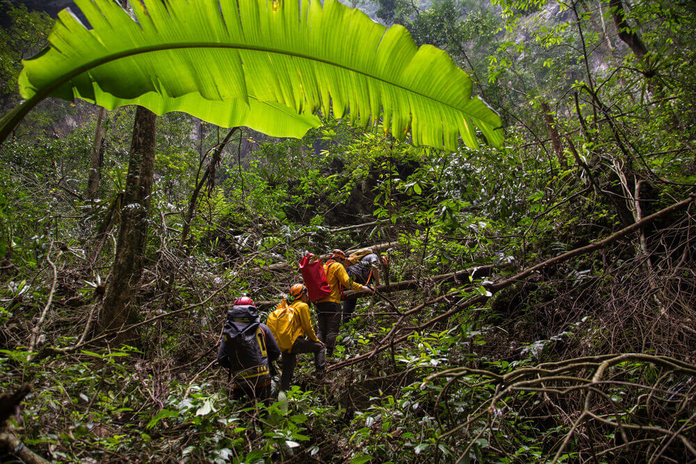 Du khách theo đường Hồ Chí Minh (nhánh Tây),từ đoạn km 39,sẽ đi bộ giữa rừng sâu vào bản Đoòng,một bản nằm biệt lập giữa vùng lõi Vườn quốc gia PN-KB,mất khoảng hai giờ. Trên đường đi,du khách nhiều phen được kinh sợ và lo lắng vì những đoạn đường trượt lở với vách ta luy bên dương và bên âm cao và sâu cả trăm mét,tạo nên một khung cảnh ngoạn mục.