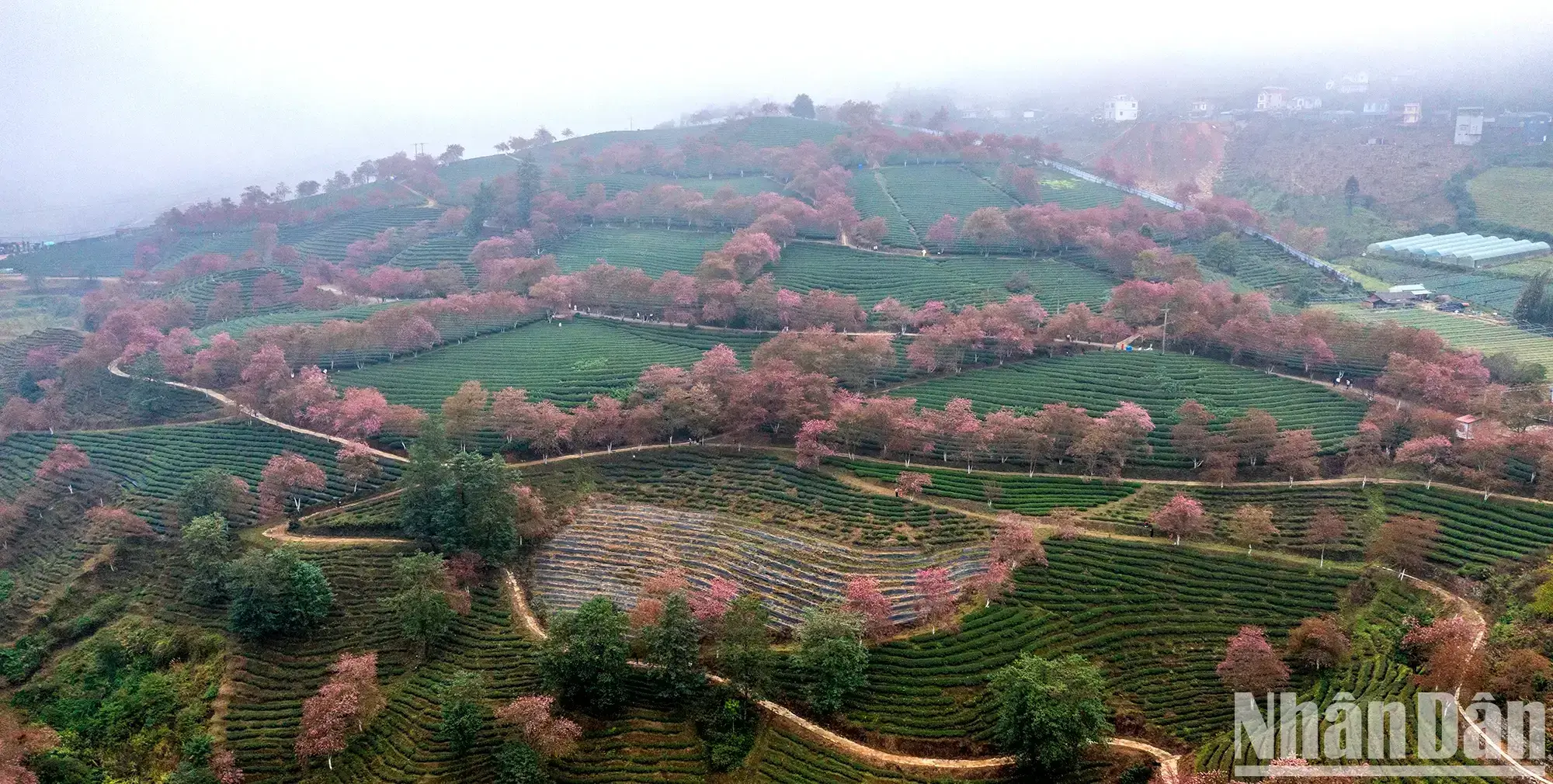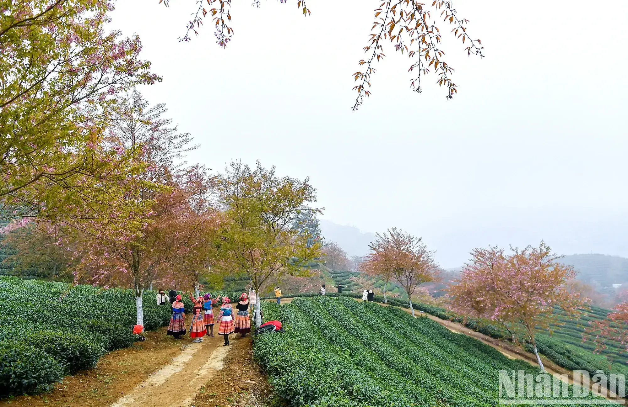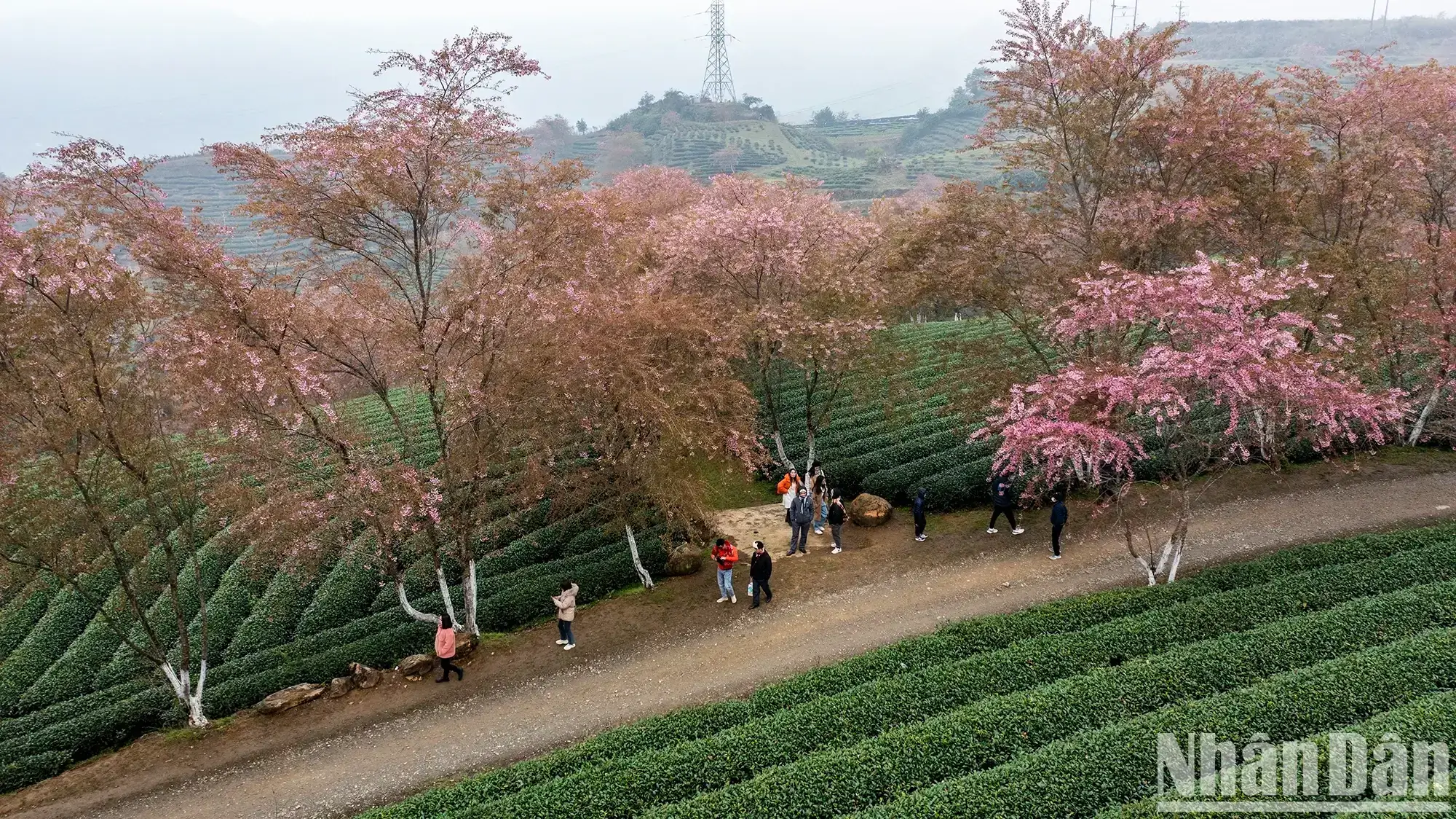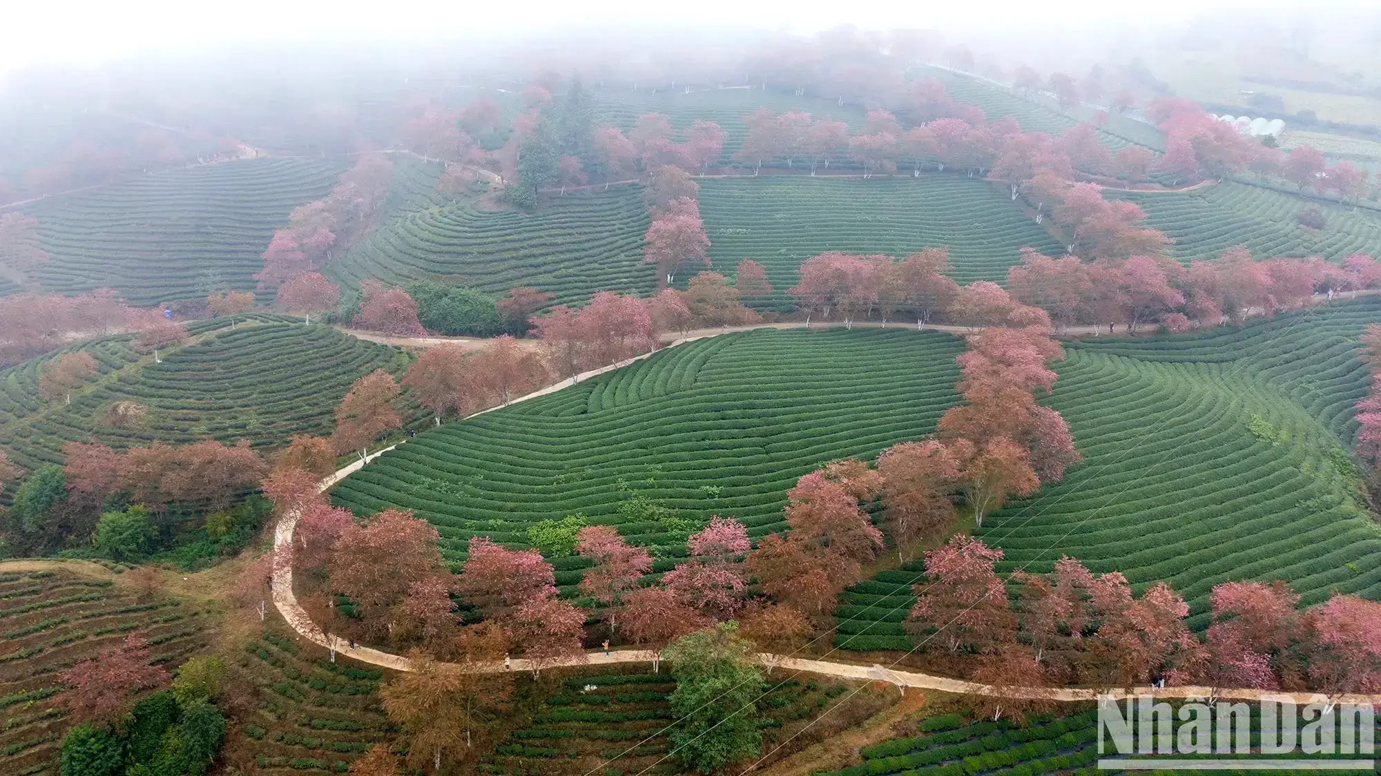Những bông hoa mai anh đào đua nhau bung nở khoe sắc đan xen trên những dải đồi chè xanh non mơn mởn.