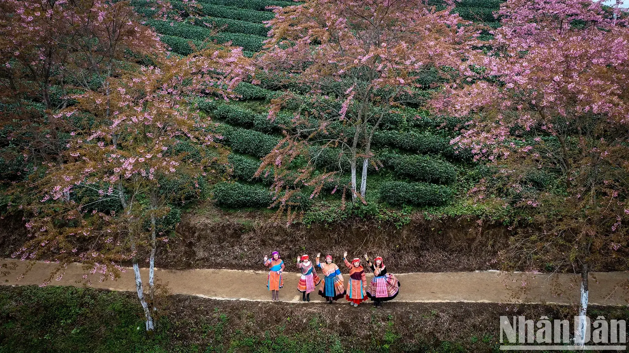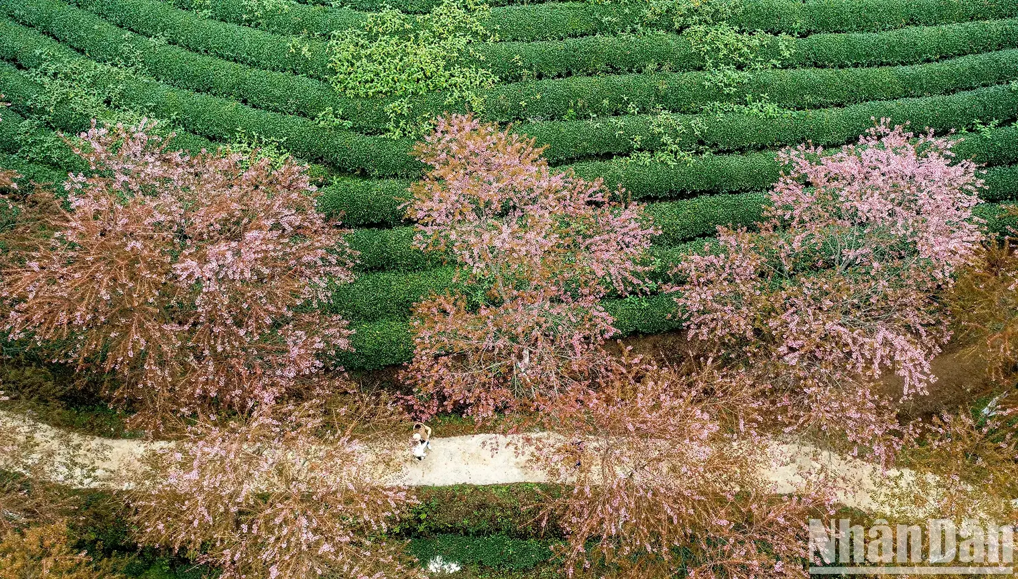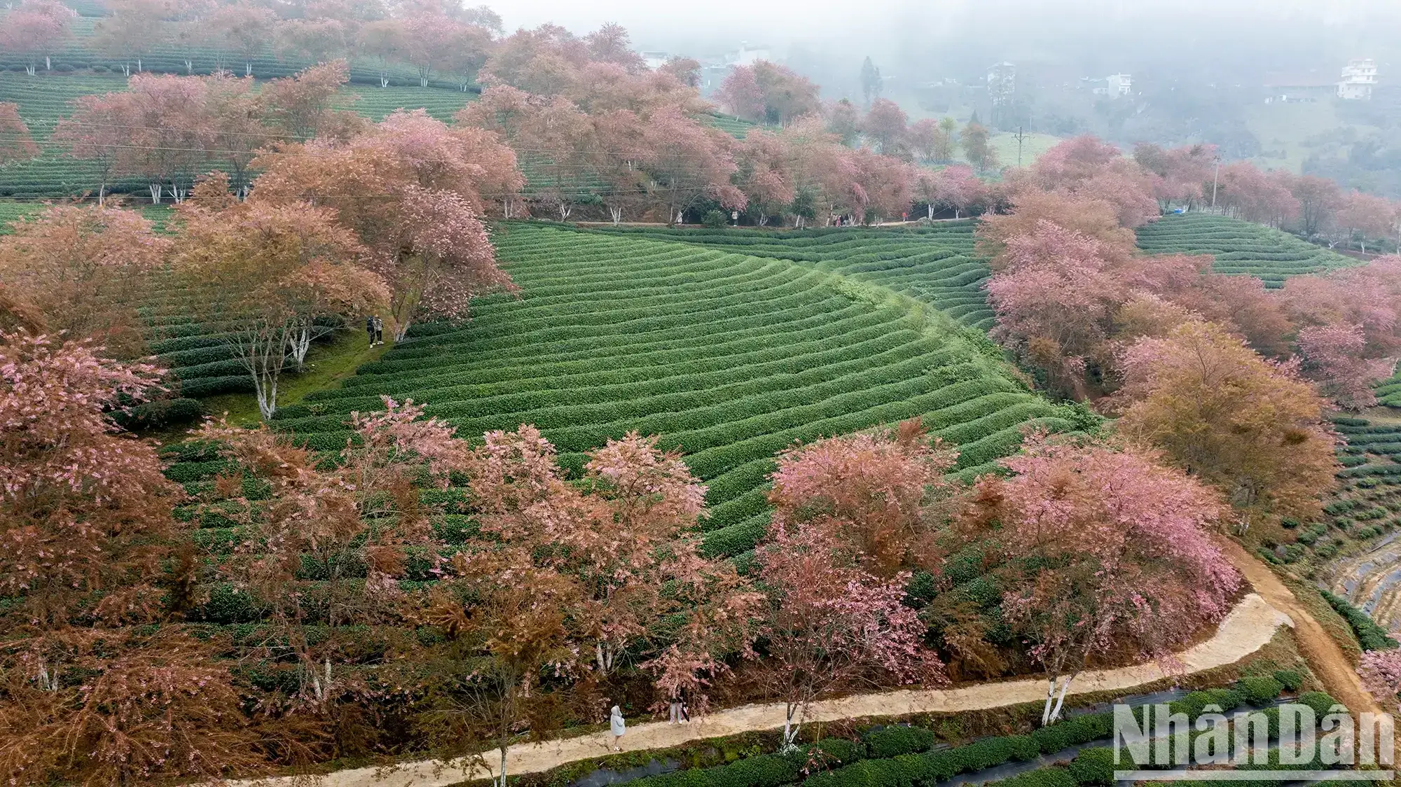 Những bông hoa mai anh đào đua nhau bung nở khoe sắc đan xen trên những dải đồi chè xanh non mơn mởn.