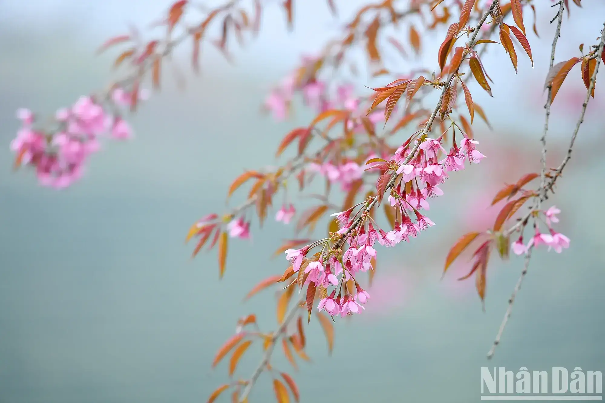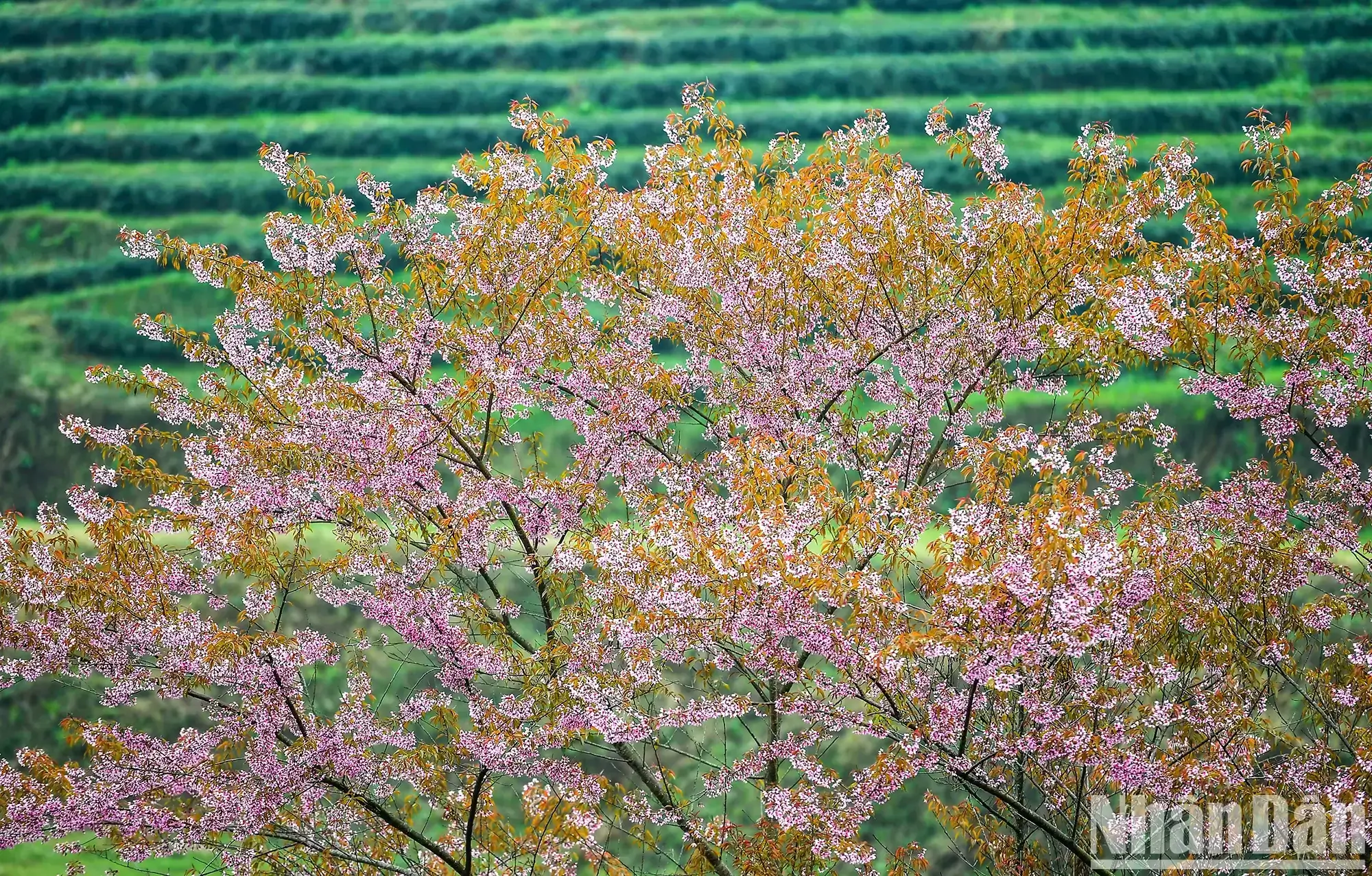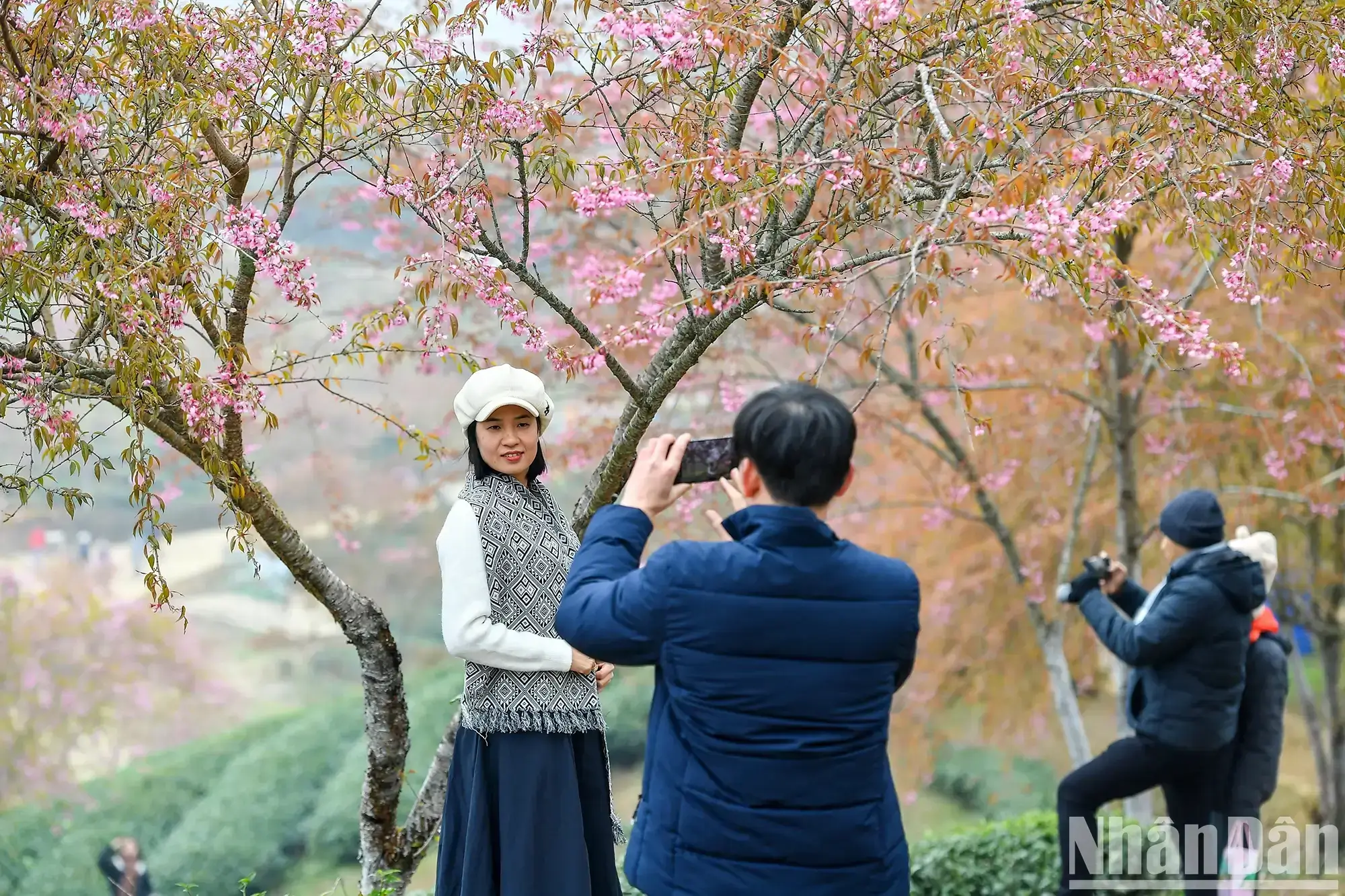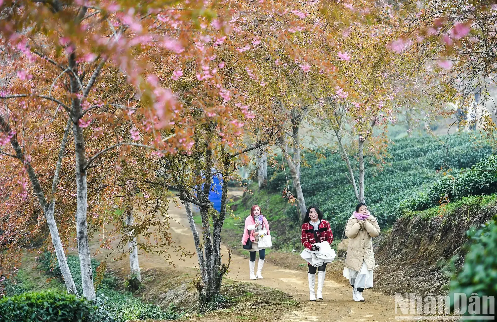 Những bông hoa mai anh đào đua nhau bung nở khoe sắc đan xen trên những dải đồi chè xanh non mơn mởn.