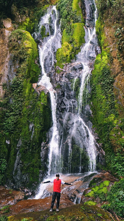 Trên cung đường mới từ đỉnh xuống chân núi,nam du khách đến từ TPHCM không khỏi ấn tượng với vẻ đẹp của thác Háng Xua (Ảnh: Lâm Hoàng Thiên Vũ)