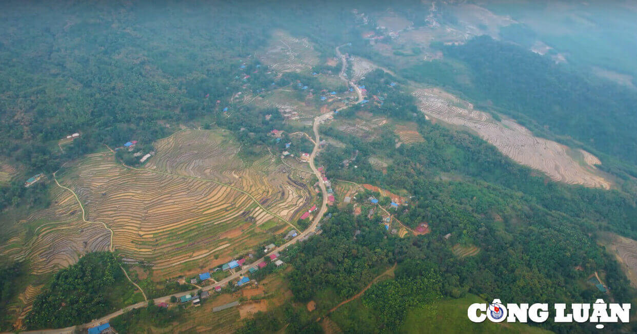 Từ trên cao có thể phóng tầm mắt ra xa,bao quát vẻ đẹp của những thửa ruộng bậc thang ở Pù Luông nằm bên lưng chừng núi giữa ngút ngàn màu xanh của núi rừng,tạo nên một bức tranh phong cảnh đẹp,yên bình.