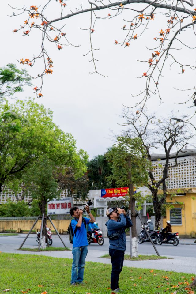 Các nhiếp ảnh gia say sưa chụp hình hoa gạo nở trên đường Lê Lợi. Ảnh: Hoàng Lê