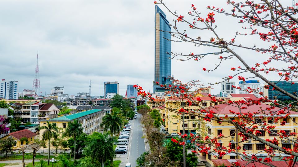 Hoa gạo khoe sắc cùng khách sạn cao nhất Huế. Ảnh: Hoàng Lê