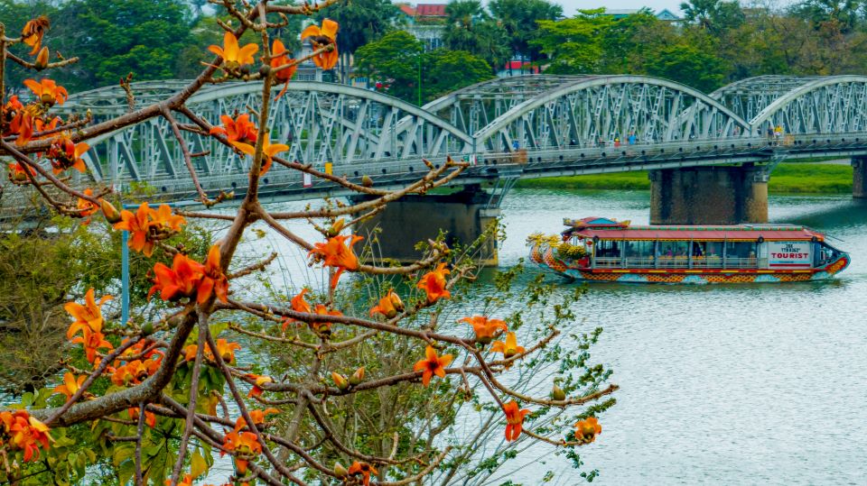 Hoa gạo khoe sắc bên cầu Trường Tiền – cây cầu đầu tiên bắc qua sông Hương tại thành phố Huế. Ảnh: Hoàng Lê
