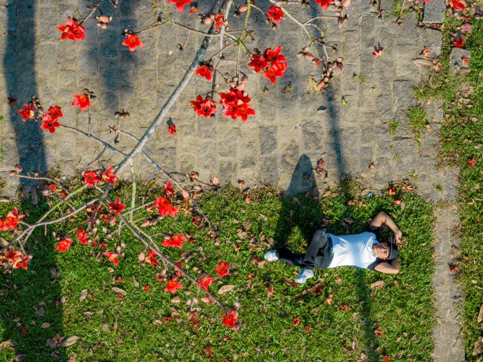 Nằm ngắm hoa gạo nở trong giây lát cũng là một gợi ý cho du khách khi đến Huế dịp này. Ảnh: Hoàng Lê