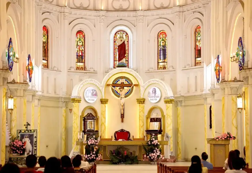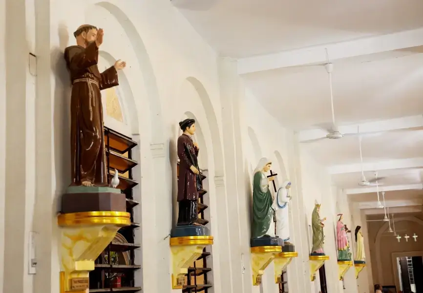 Bên trong các gian,tường đều được bài trí nhiều tượng thánh đủ kích cỡ.