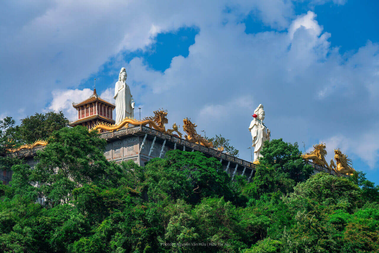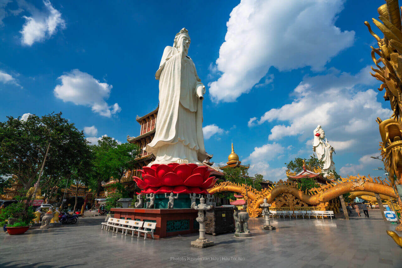 Bước vào bên trong khuôn viên chùa,du khách có thể chiêm ngưỡng những pho tượng trang nghiêm,được đúc tạc kĩ xảo. Đặc biệt phải kể đến tượng Quan Thế Âm được đúc bằng đồng và đá cẩm thạch. Khi nhìn từ trên cao,điểm nhấn của ngôi chùa chính là 2 bức tượng Quan Thế Âm màu trắng ở 2 góc trái,phải của quần thể chùa. Cả 2 bức tượng đều toát lên vẻ uy nghiêm nhưng cũng không thiếu nét hiền hậu,bác ái.