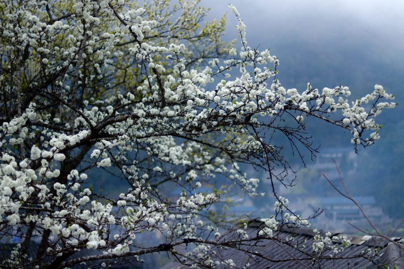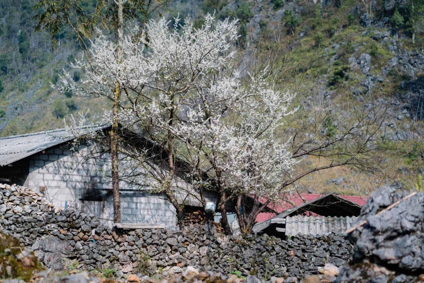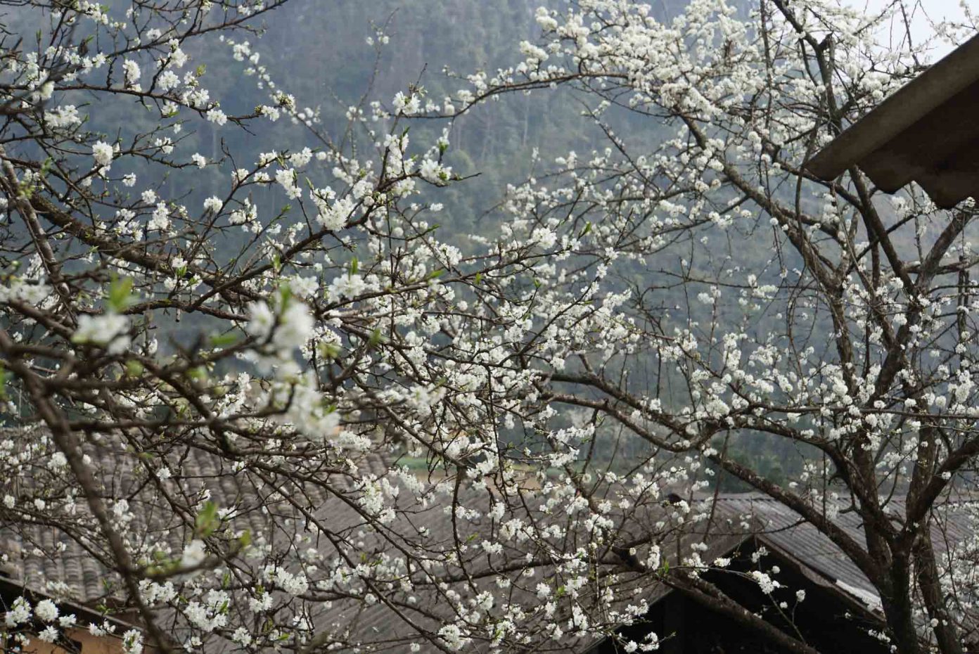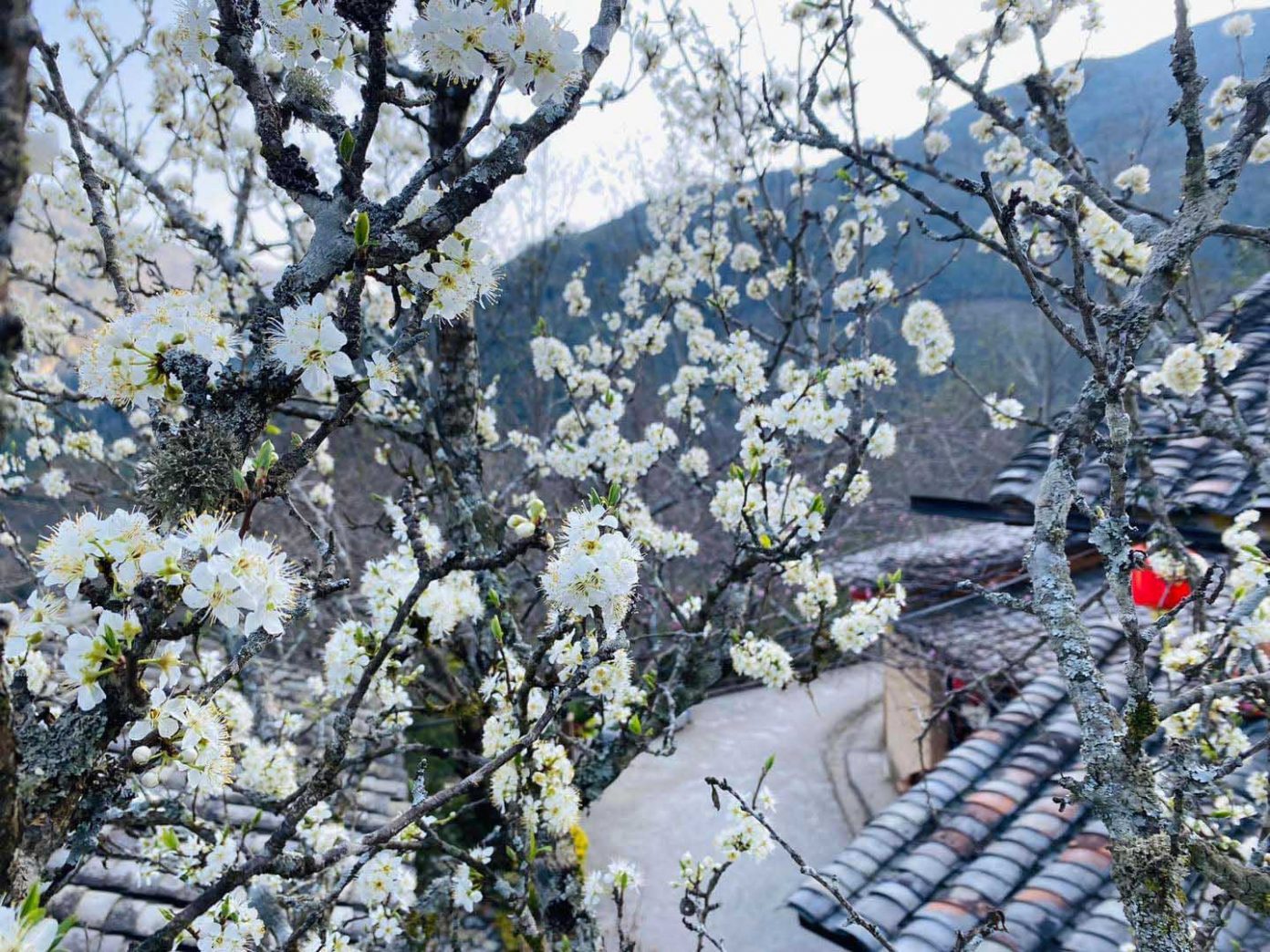 Những cành mận khẳng khiu nở hoa trắng xóa bên những mái nhà đặc trưng của người Mông. Ảnh: Hà Giang Trẻ