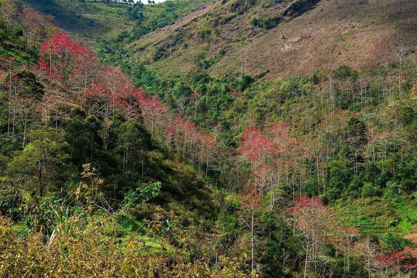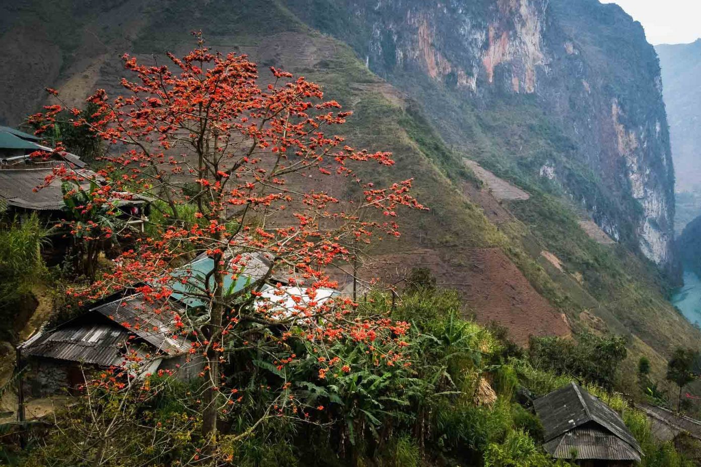 Đến Hà Giang vào đầu tháng 3,du khách cũng có thể bắt gặp những cánh hoa gạo đỏ rực dọc quốc lộ 4C dẫn đến trung tâm huyện Đồng Văn. Ảnh: Hà Giang Trẻ