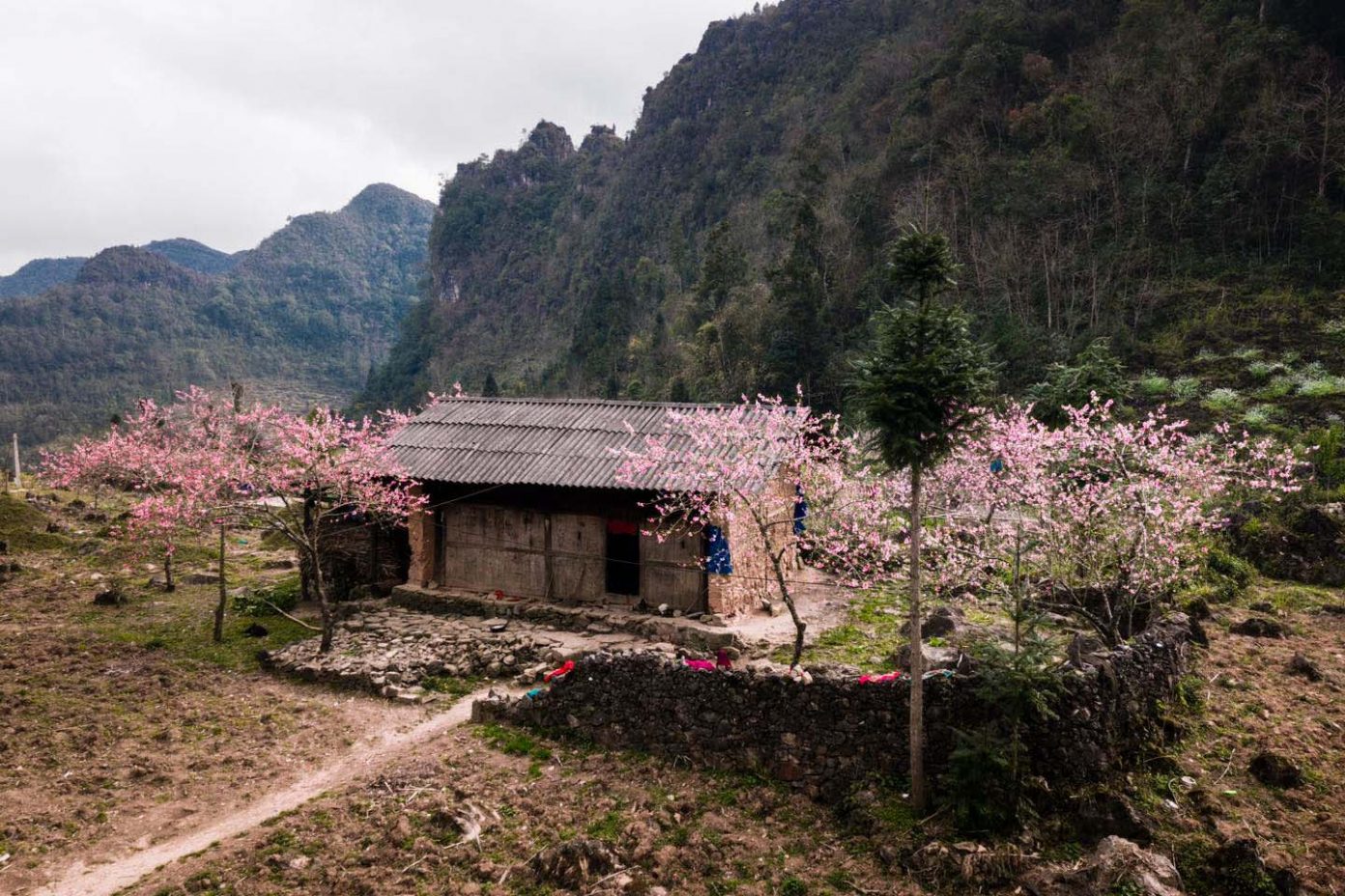 Hoa đào được người dân trồng ven nhà,bên cạnh hàng rào đá. Ảnh: Hà Giang Trẻ