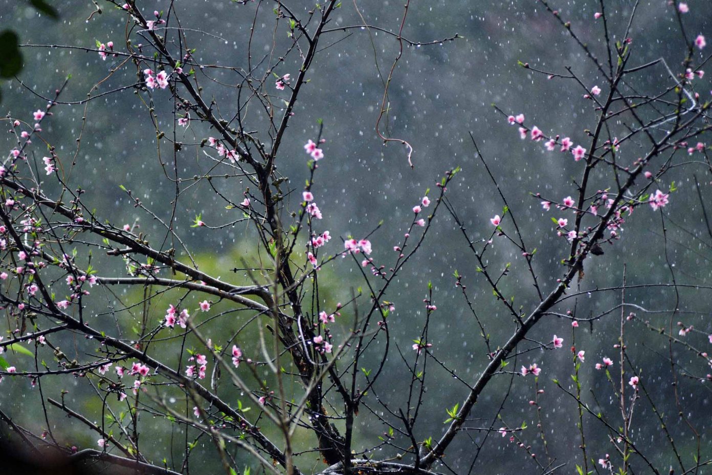 Hoa đào khoe sắc trong mưa Xuân. Ảnh: Hà Giang Trẻ